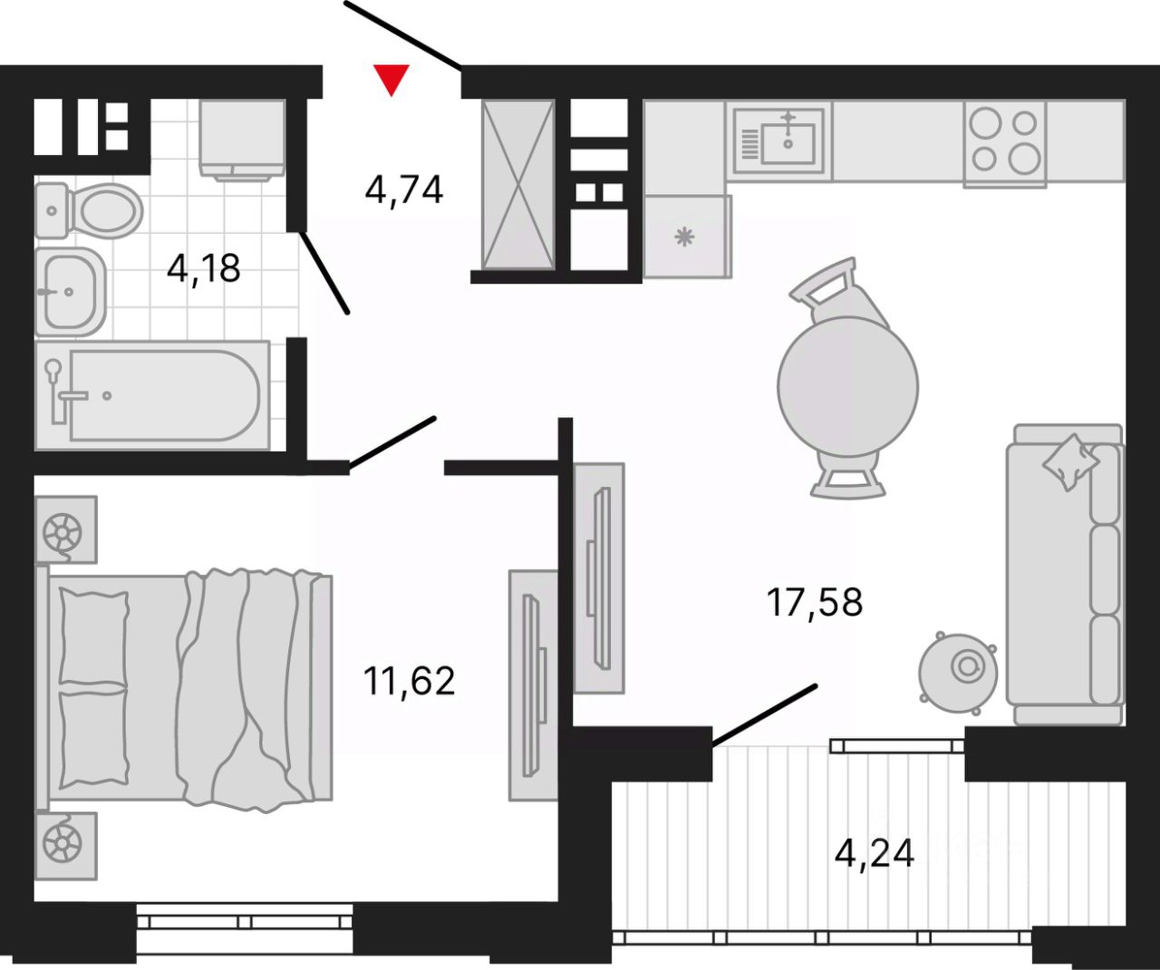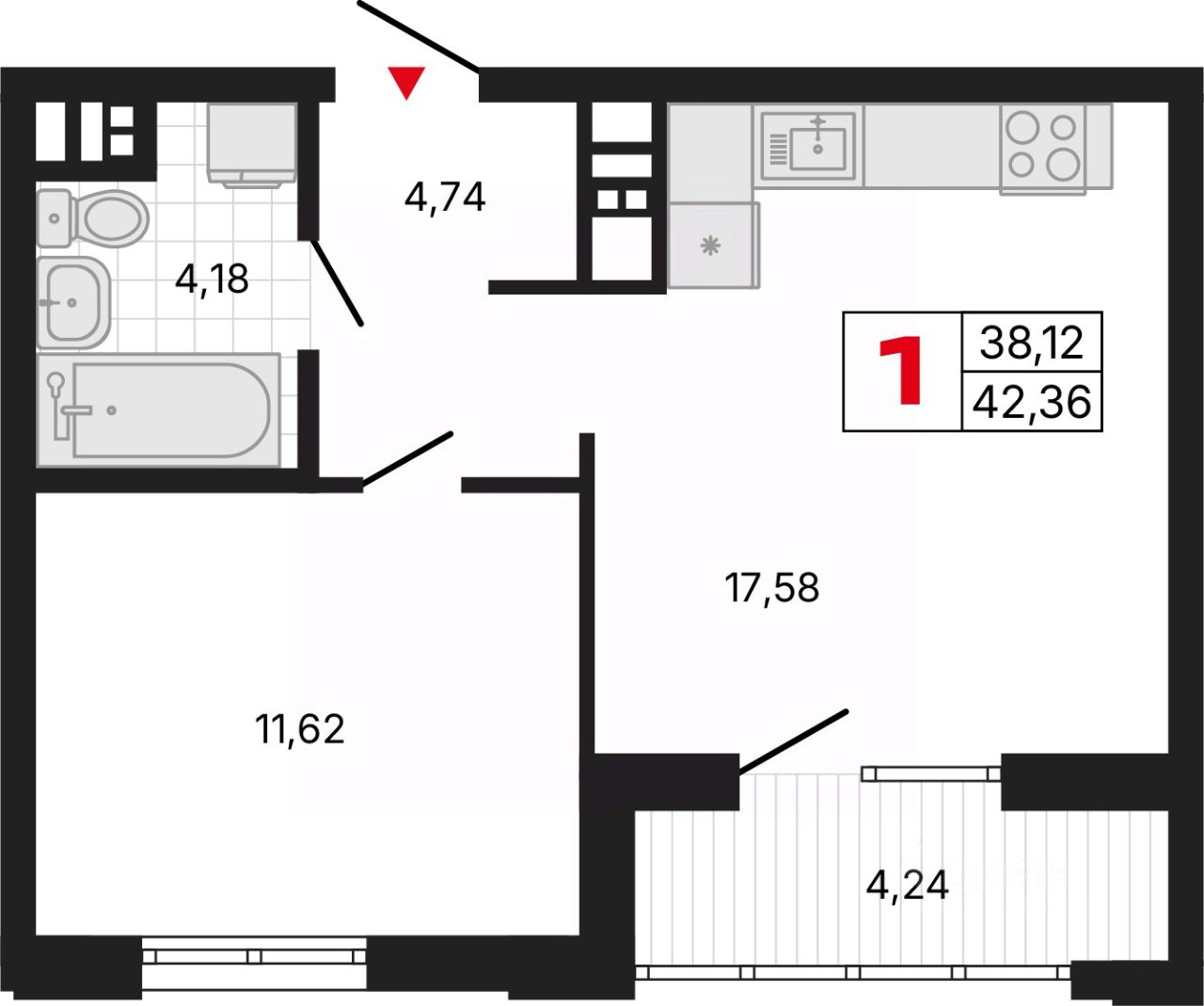 Однокомнатная квартира с предчистовой отделкой в ЖК ''Милый дом'' на 4 этаже. Общая площадь: 42.28 кв.м., жилая: 11.62 кв.м., площадь просторной кухни-столовой: 17.58 кв.м. Все окна выходят на одну сторону. В квартире одна лоджия, один совмещенный санузел. Высота потолков 2.7 м.