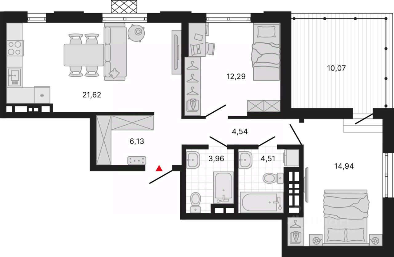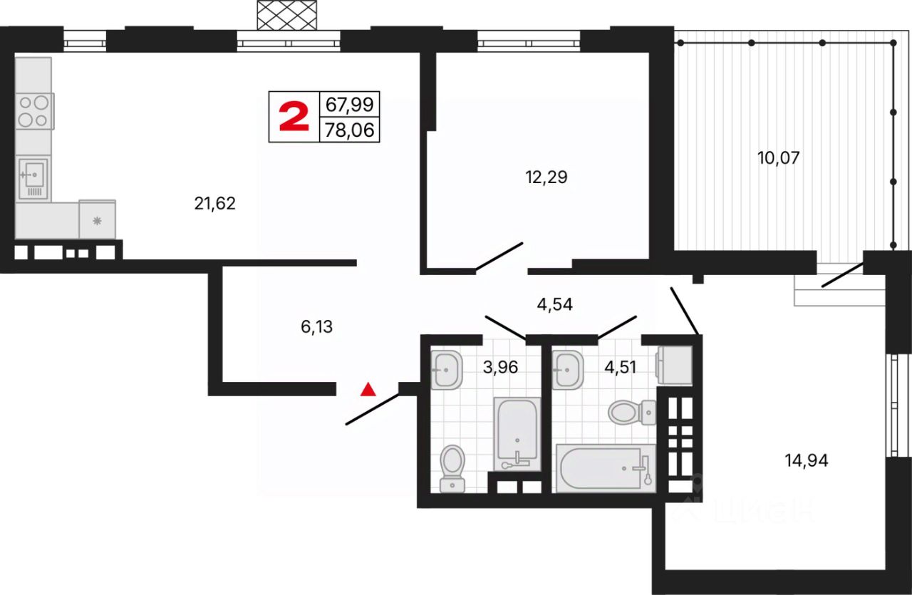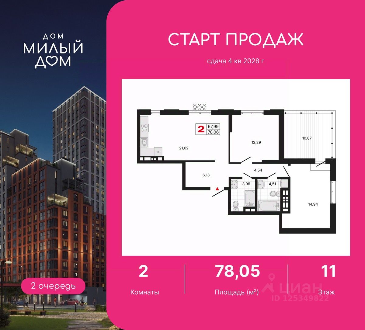 2-комн. квартира с предчистовой отделкой в ЖК ''Милый дом'' на 11 этаже. Общая площадь: 78.05 кв.м., жилая: 27.23 кв.м., площадь просторной кухни-столовой: 21.62 кв.м. Угловая квартира, окна oбecпeчивaют paвнoмepнoe ocвeщeниe в тeчeниe дня. В квартире одна лоджия, два совмещенных и два раздельных санузла. Наличие в квартире террасы дает возможность для создания зон отдыха в кругу семьи и друзей. Высота потолков 2.7 м.