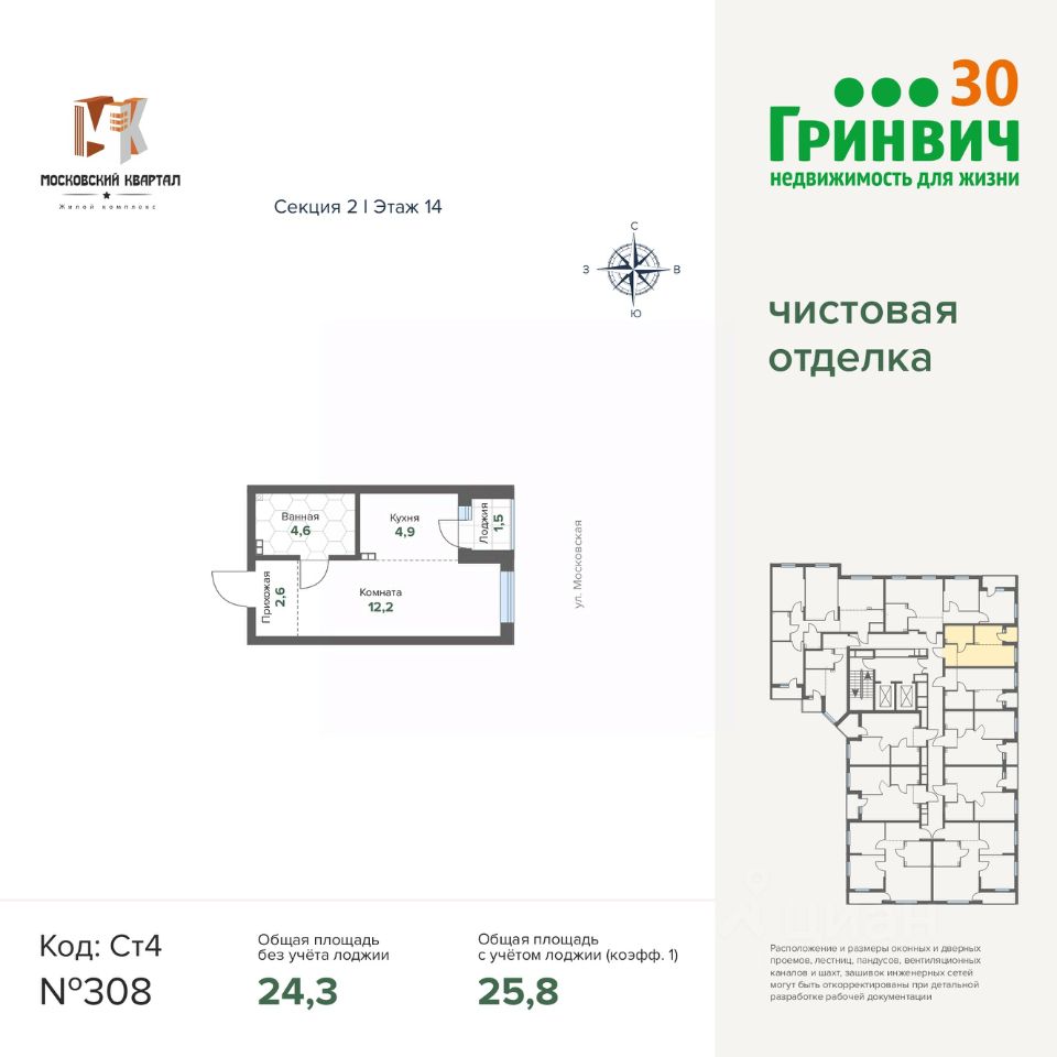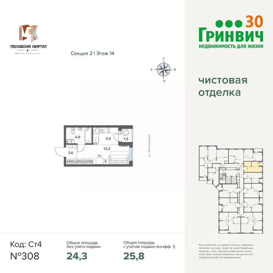 Продаётся студия в строящемся доме (Дом 12), срок сдачи: IV-кв. 2026, общей площадью 25.78 кв.м., на 14 этаже.
