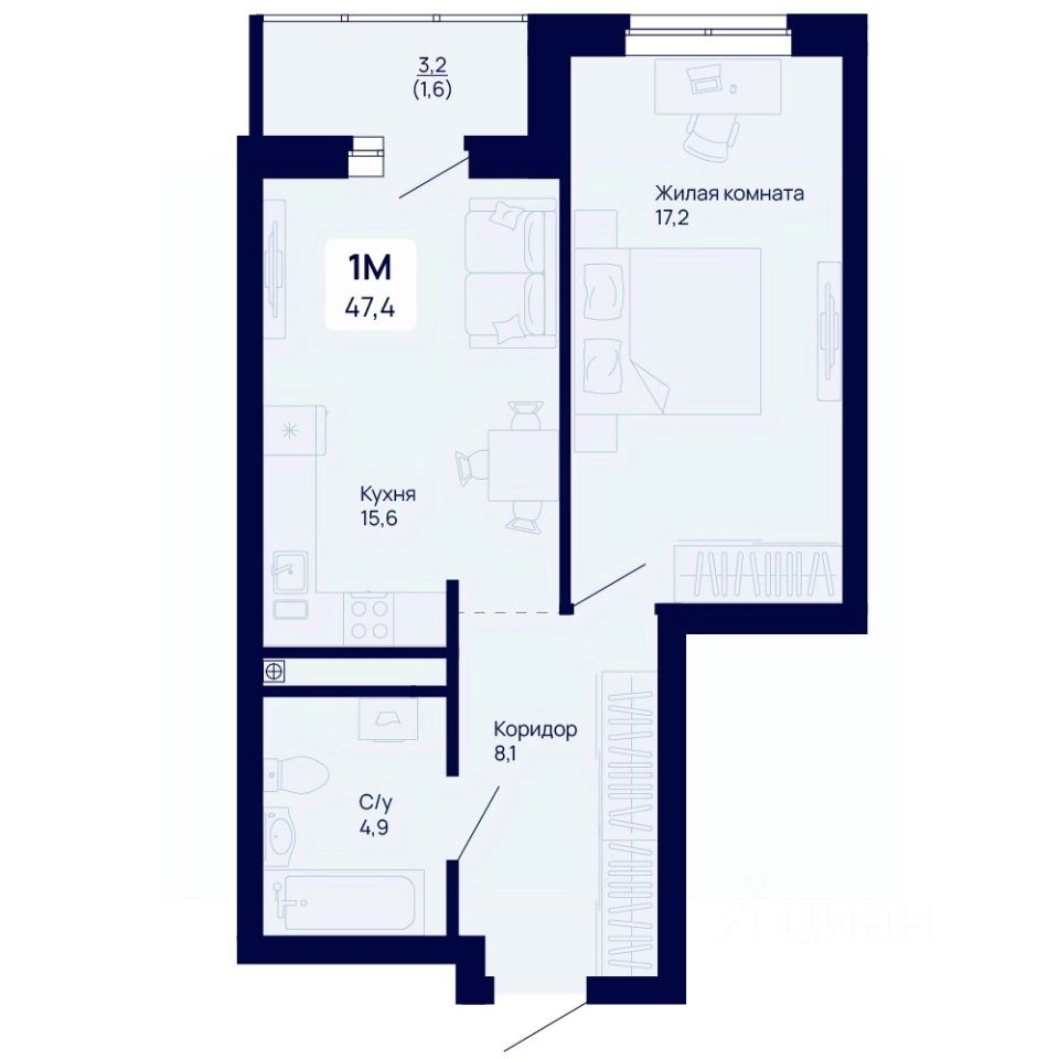 Общая площадь47,4 м2