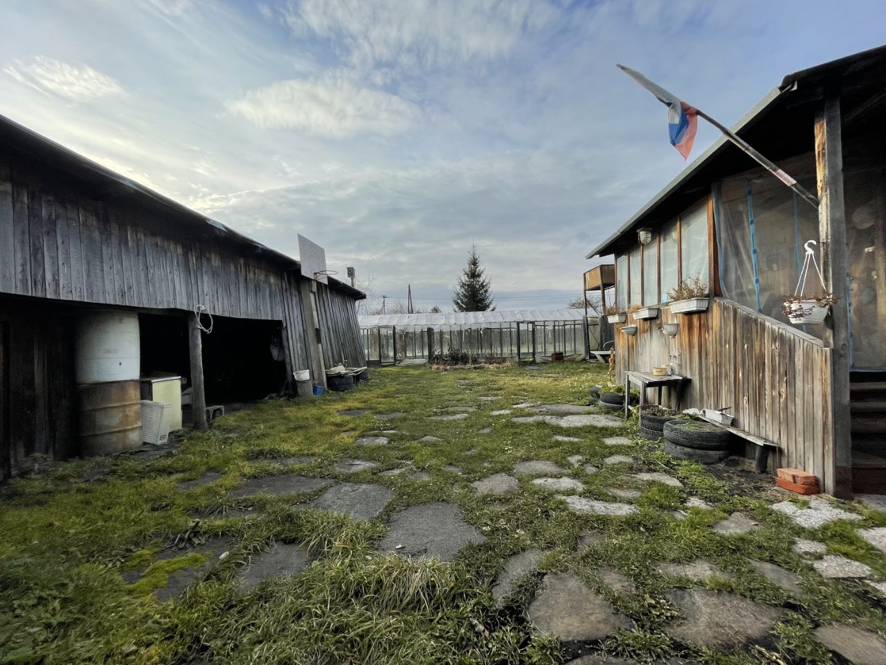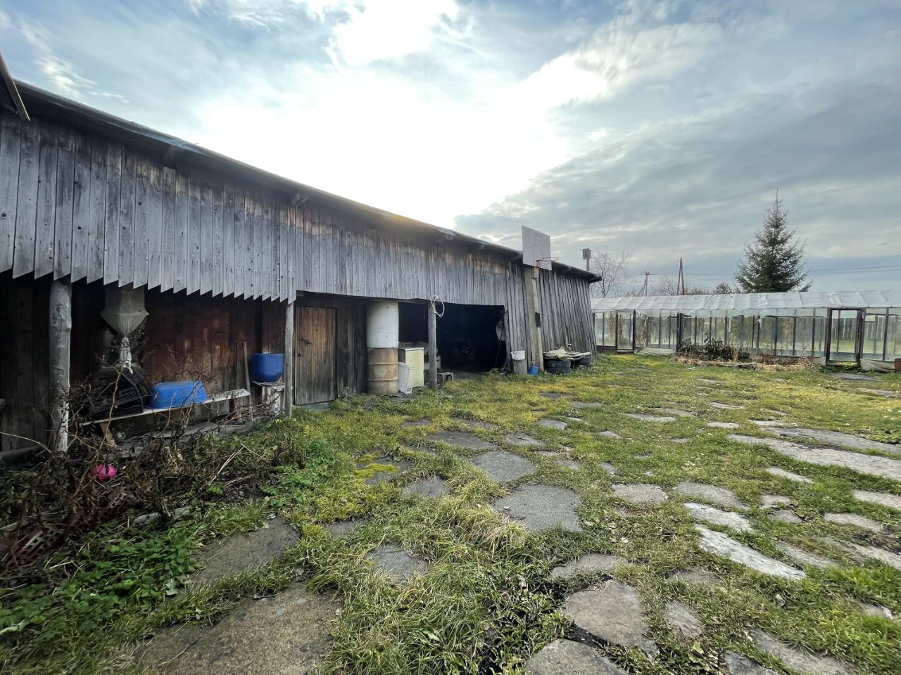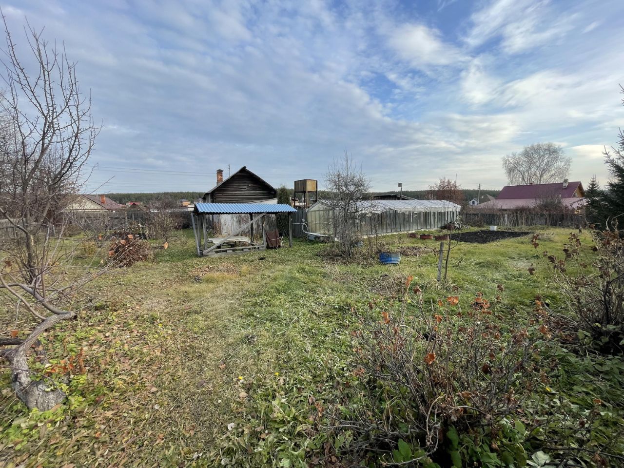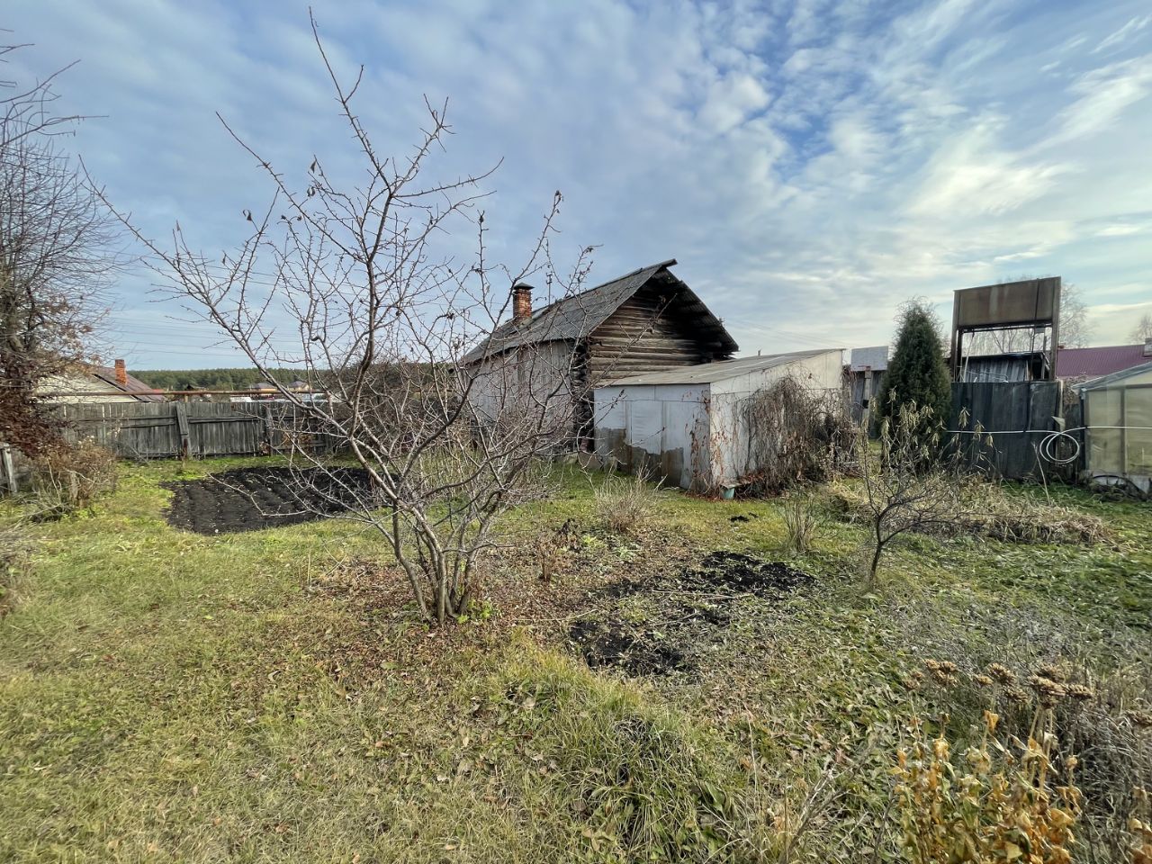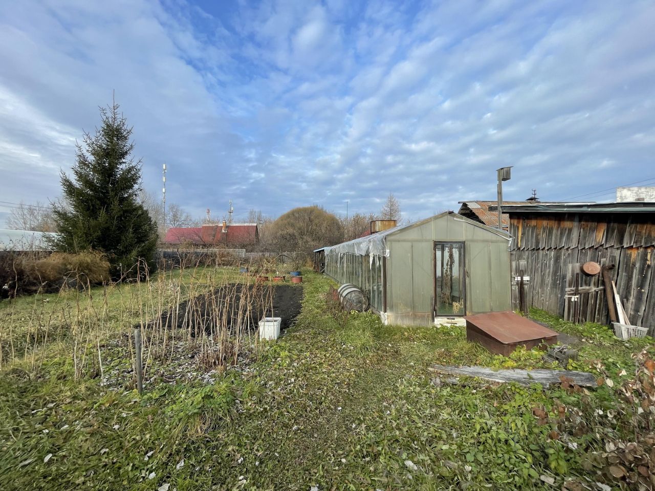 К Участку в подарок достаются хозяйственные постройки: функционирующая баня, две неплохие теплицы, навес, металлический гараж и жилой дом из бревна 1881 года постройки с русской печью!