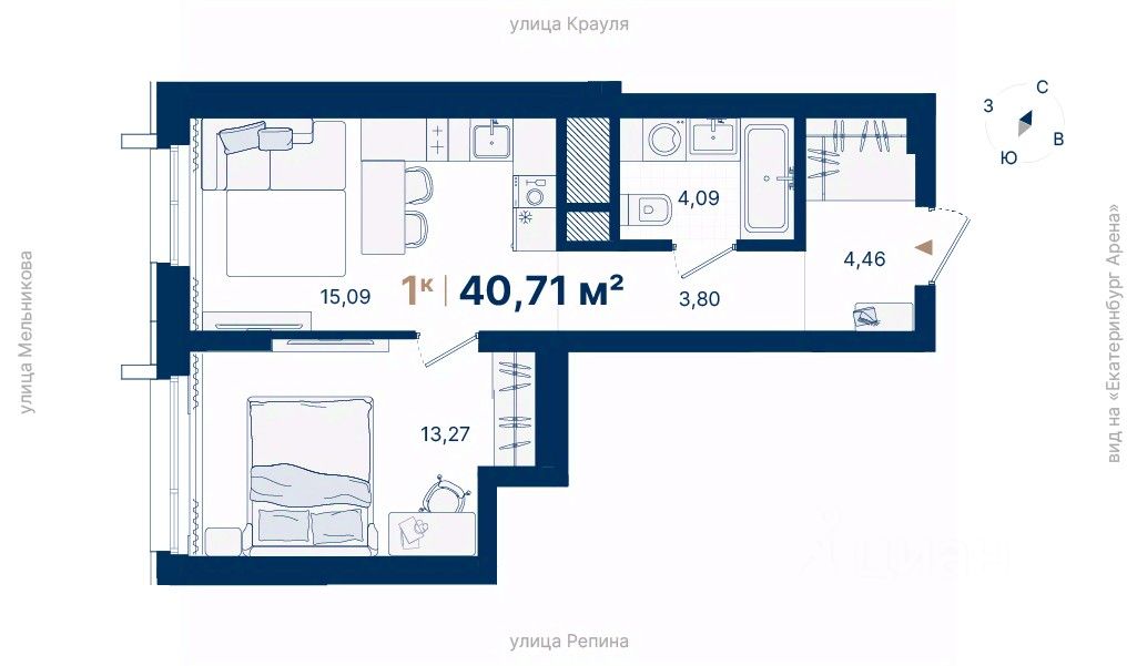 Дома расположены на стрелке улиц Репина и Крауля, рядом со стадионом ''Екатеринбург Арена''. Здесь уже есть все необходимое для жизни: сады, школы, поликлиники и магазины.