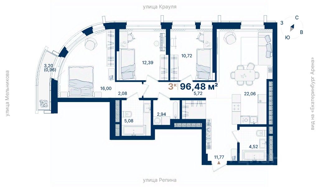 Дома расположены на стрелке улиц Репина и Крауля, рядом со стадионом ''Екатеринбург Арена''. Здесь уже есть все необходимое для жизни: сады, школы, поликлиники и магазины.