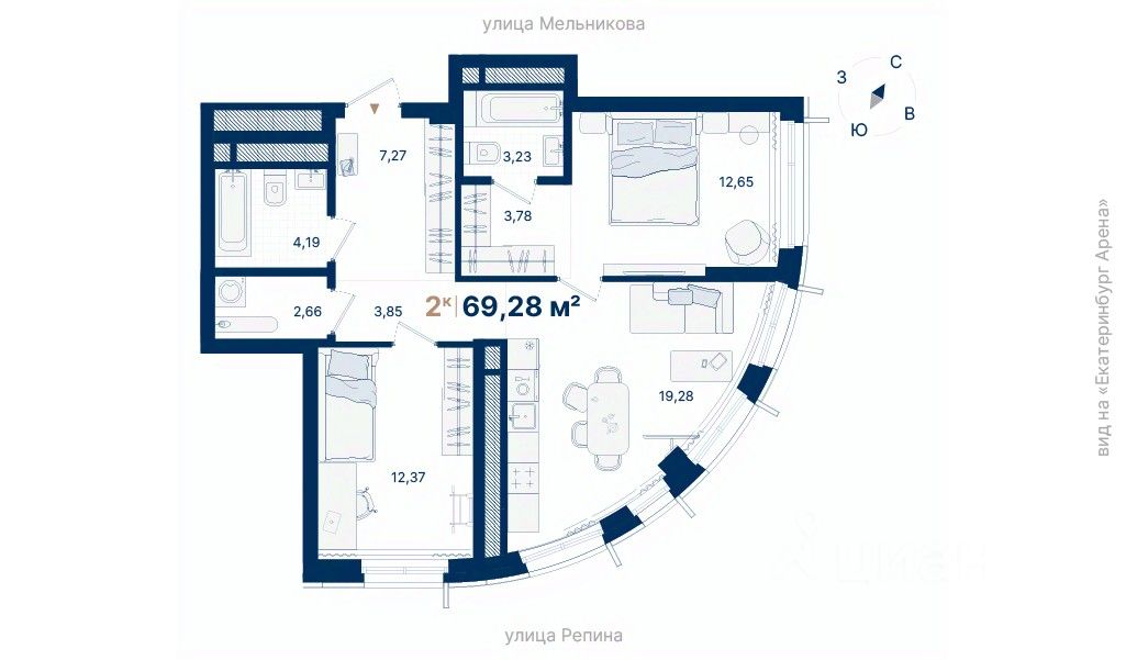 Дома расположены на стрелке улиц Репина и Крауля, рядом со стадионом ''Екатеринбург Арена''. Здесь уже есть все необходимое для жизни: сады, школы, поликлиники и магазины.