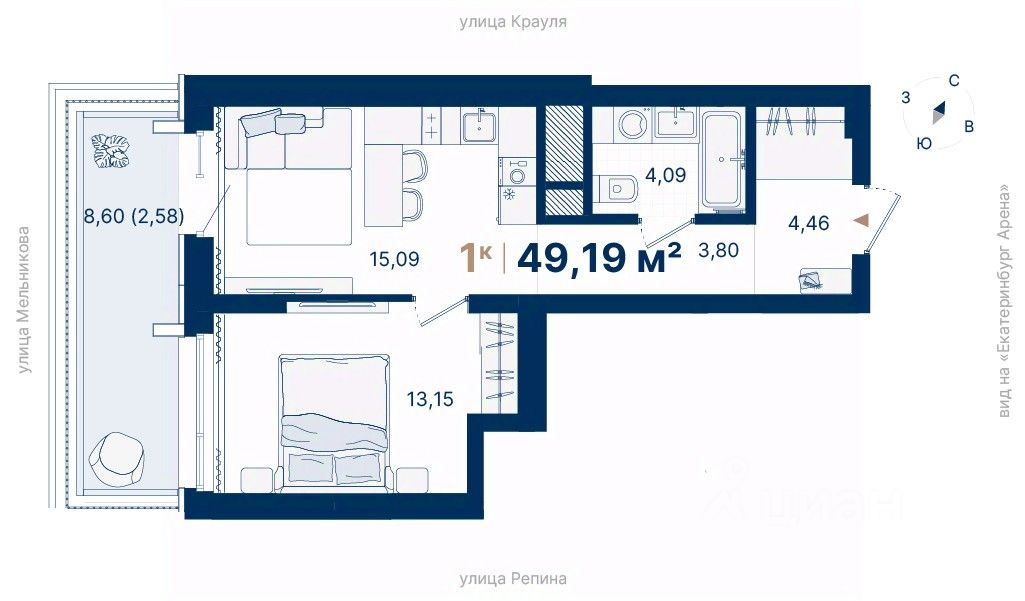 Дома расположены на стрелке улиц Репина и Крауля, рядом со стадионом ''Екатеринбург Арена''. Здесь уже есть все необходимое для жизни: сады, школы, поликлиники и магазины.