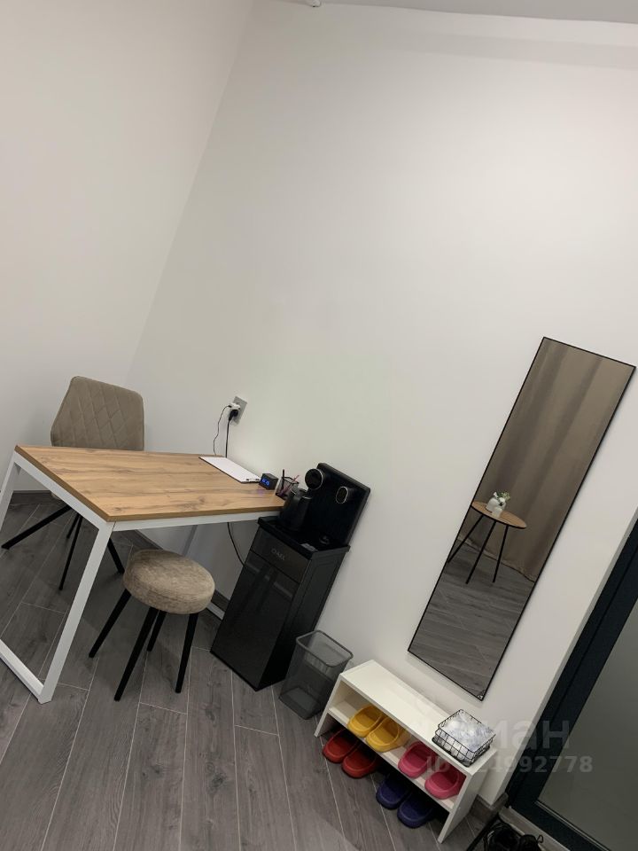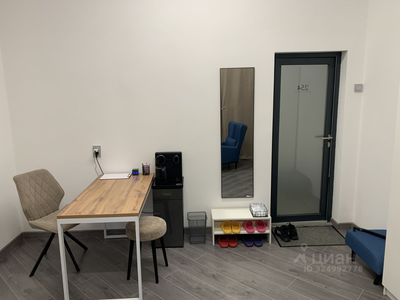 Кабинет оборудован мягким диваном и мягким креслом, журнальным столиком и торшером, зеркалом, есть рабочая зона с компьютерным столом и креслом + мягкий табурет, кулер, шторы, Wi-Fi. Также есть кофейная зона с кофейным постаматом и постаматом для перекуса рядом с кабинетом.