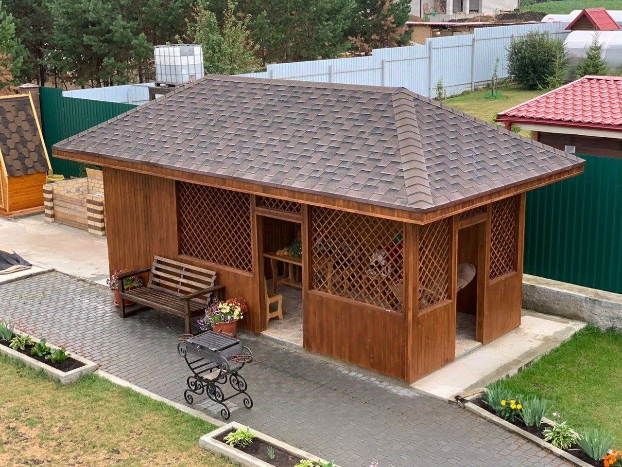 УЧАСТОК: -15 соток -перед домом лежит бехатон -закрытая стоянка на два автомобиля -по периметру участка забетонированный слив для весенних вод -забор: кирпич -автоматические ворота (с пульта) ковка -8 - 3х метровых грядок отделанных кирпичом и забетонированными проходами -большой зеленый газон 4 сотки и посаженные голубые ели и яблони (плодоносят) -жимолость, черная смородина, 4 сорта сирени - большая беседка с отделением для садовой утвари и площадкой для отдыха - отдельный кирпичный дом в тон основного дома в нем: мужская мастерская, генератор, скважина - дорожки бехатон и вдоль них сделаны бордюры с выделенными клумбами для цветов - компостная яма из двух отделений с плодородной землей - уличный туалет (новый), не использовался