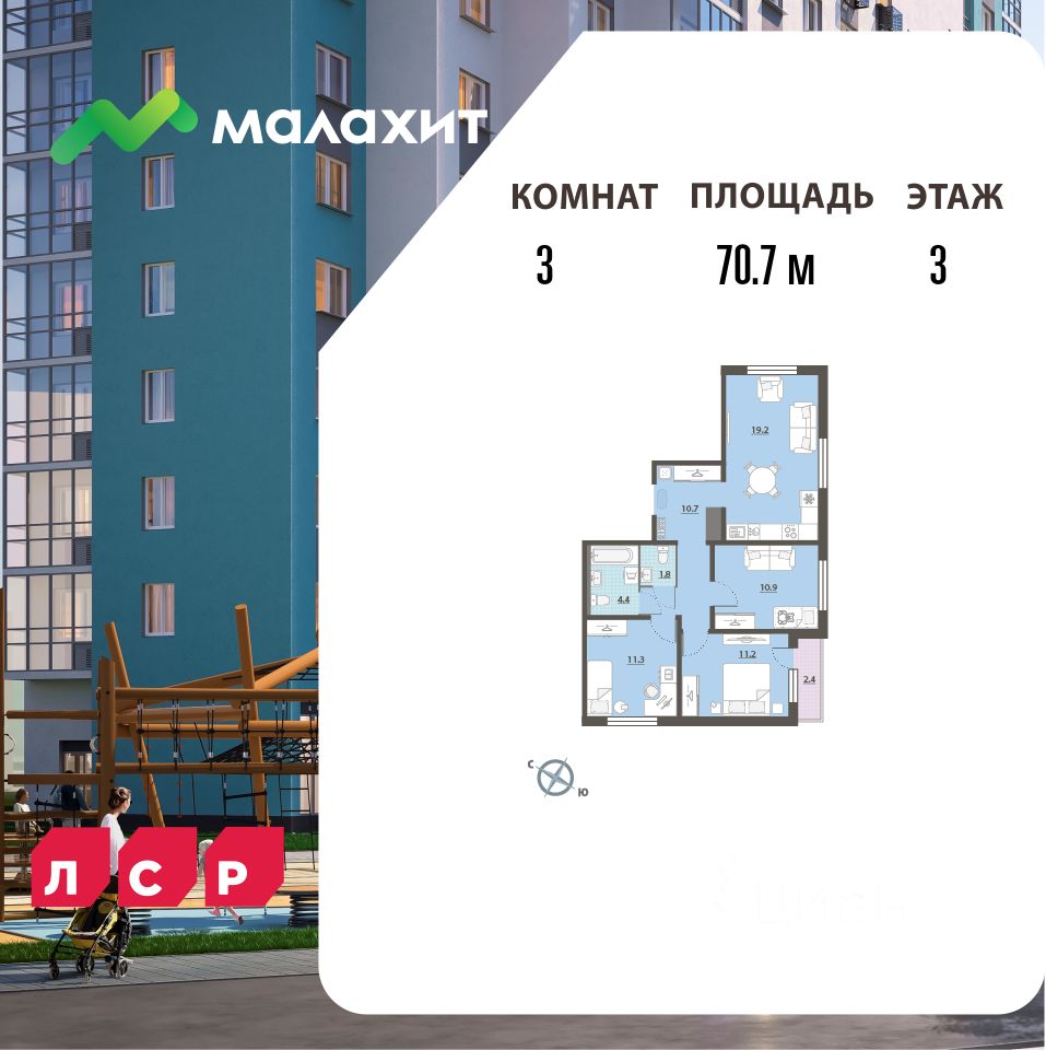 Квартира располагается на 3 этаже 15-этажного дома в ЖК Малахит. Застройщик - ЛСР, сдача дома - III квартал 2027 года. Парковка автомобилей - наземная. Инфраструктура: школа, детский сад, детские площадки, спортивные площадки, места для отдыха, супермаркет, коммерческие объекты.