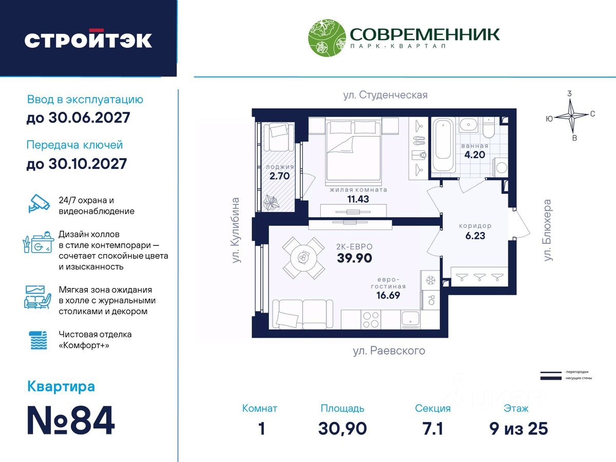 Время жить счастливо Современник — знаковый парк-квартал в интеллигентном районе Втузгородок, откуда недалеко до центра, а вблизи ведущие вузы и театры. Квартал состоит из 8 очередей строительства. Шесть очередей уже сданы и заселены, седьмая строится. В продаже квартиры от застройщика: 1 этап седьмой очереди. Объединяет квартал большой внутренний парк площадью в гектар — богатый прогулочными маршрутами, тенистыми деревьями, пространствами для отдыха, спорта и детских игр. С внешней стороны, у домов седьмой очереди, появится гостевой центр. Проект создавали в KCAP Architects and Planners, архитектурном бюро из Нидерландов, чьи работы украшают ландшафты Гамбурга, Антверпена и других городов Европы. Технологии, продуманное пространство и трендовый облик зданий создают размеренную атмосферу для жизни здесь. Достойное окружение До проспекта Ленина на машине вы доберётесь за 10 минут, а с другой стороны, неподалёку — Шарташский лесопарк с озером Шарташ, которому около миллиона лет. Здесь для вас пляжи, лодочные станции, тропы для бега и кафе. В квартале уже работают супермаркеты, пекарни, салон красоты и не только. Ближние школы, гимназии и университеты помогут расправить крылья новым поколениям, а детские сады станут заботливой средой в начале пути. Кстати, на территории квартала спроектирован муниципальный детский сад на 200 мест. Выходите во двор Гуляйте по зелёным аллеям или устройтесь с книгой в гамаке. Займитесь воркаутом, футболом, баскетболом или пинг-понгом. Проводите семейные праздники под крытым амфитеатром или отправьте детей играть на насыщенный плейхаб. Мы всё предусмотрели. На закрытой территории без машин и посторонних спокойно и безопасно. Видеонаблюдение и освещение добавляют ещё больше уверенности. Впечатляющая доминанта у домов 7 очереди — новый гостевой центр: камерное пространство под навесом-перголой с озеленением и скамейками, чтобы встречать друзей. Ваша зона комфорта Стильное лобби Современника мы выполним в эстетике contemporary: минимализм, сочетание дерева со штукатуркой и тёмным металлом, зеркала, витражи. Обстановка из мягкой мебели, растений и книг. Двери из холла выходят на обе стороны. Внутри — комната для колясок и самокатов. На -1 этаже подземный паркинг с 201 машино-местом, куда легко попасть на лифте прямо с вашего этажа. Здесь же можно приобрести одну из 67 кладовых, чтобы хранить сезонный инвентарь. СТРОЙТЭК возводит 7 очередь в 3 этапа. Дом с привилегиями Первый этап — секция 7.1, башня в 25 этажей. Здесь 246 квартир в 19 уникальных планировках от студий до 3-комнатных, в классических и евро-вариантах. Просторные кухни-гостиные, гардеробные и окна на 2 стороны — лишь часть их плюсов. В Современнике улучшенный стандарт отделки ''Комфорт +''. Помимо комфортных сантехники и электрики, в него входят оконные стёкла Energy Light, которые помогают сохранять температуру, прочный ламинат 33 класса и устойчивые к многократной покраске виниловые обои. Белые межкомнатные двери и плинтусы подчеркнут любую цветовую гамму.
