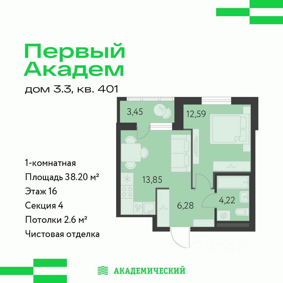 Продается 1-комнатная квартира площадью 38.2 кв.м. от девелопера ''Академический'' в жилом квартале ''Первый Академ''. Срок сдачи дома в 2028 году. Выгоды и скидка напрямую от застройщика.