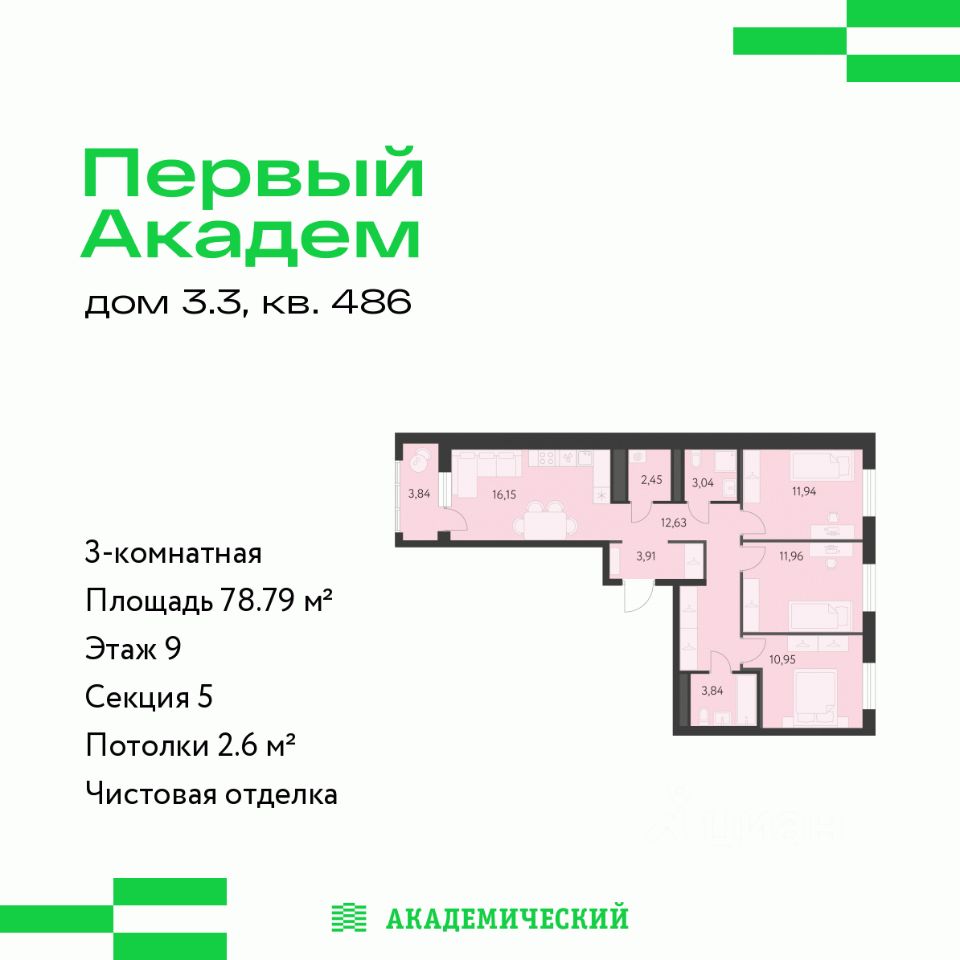 Продается 3-комнатная квартира площадью 78.79 кв.м. от девелопера ''Академический'' в жилом квартале ''Первый Академ''. Срок сдачи дома в 2028 году. Выгоды и скидка напрямую от застройщика.