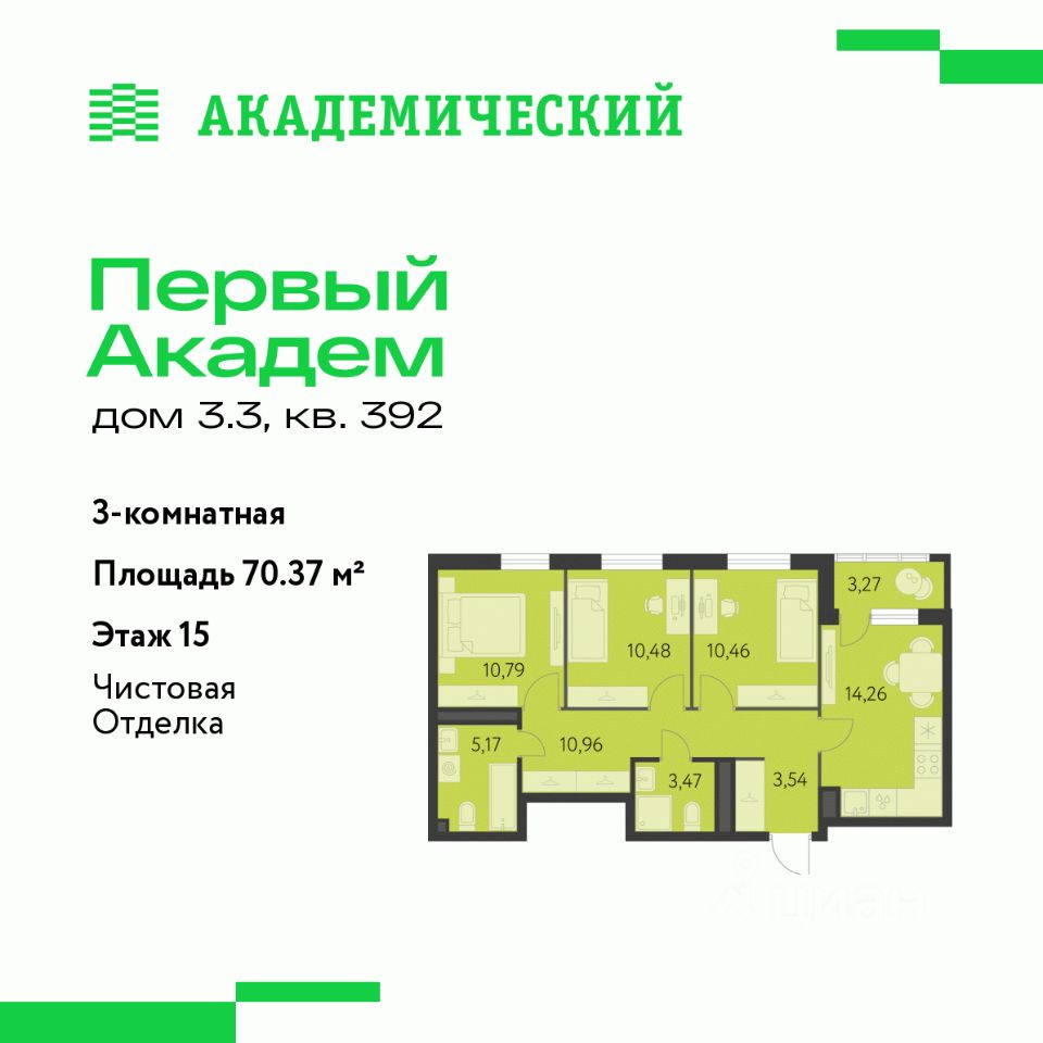 Продается 3-комнатная квартира площадью 70.37 кв.м. от девелопера ''Академический'' в жилом квартале ''Первый Академ''. Срок сдачи дома в 2028 году. Выгоды и скидка напрямую от застройщика.