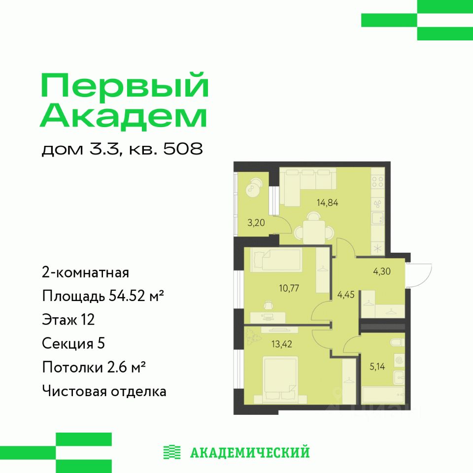 Продается 2-комнатная квартира площадью 54.52 кв.м. от девелопера ''Академический'' в жилом квартале ''Первый Академ''. Срок сдачи дома в 2028 году. Выгоды и скидка напрямую от застройщика.