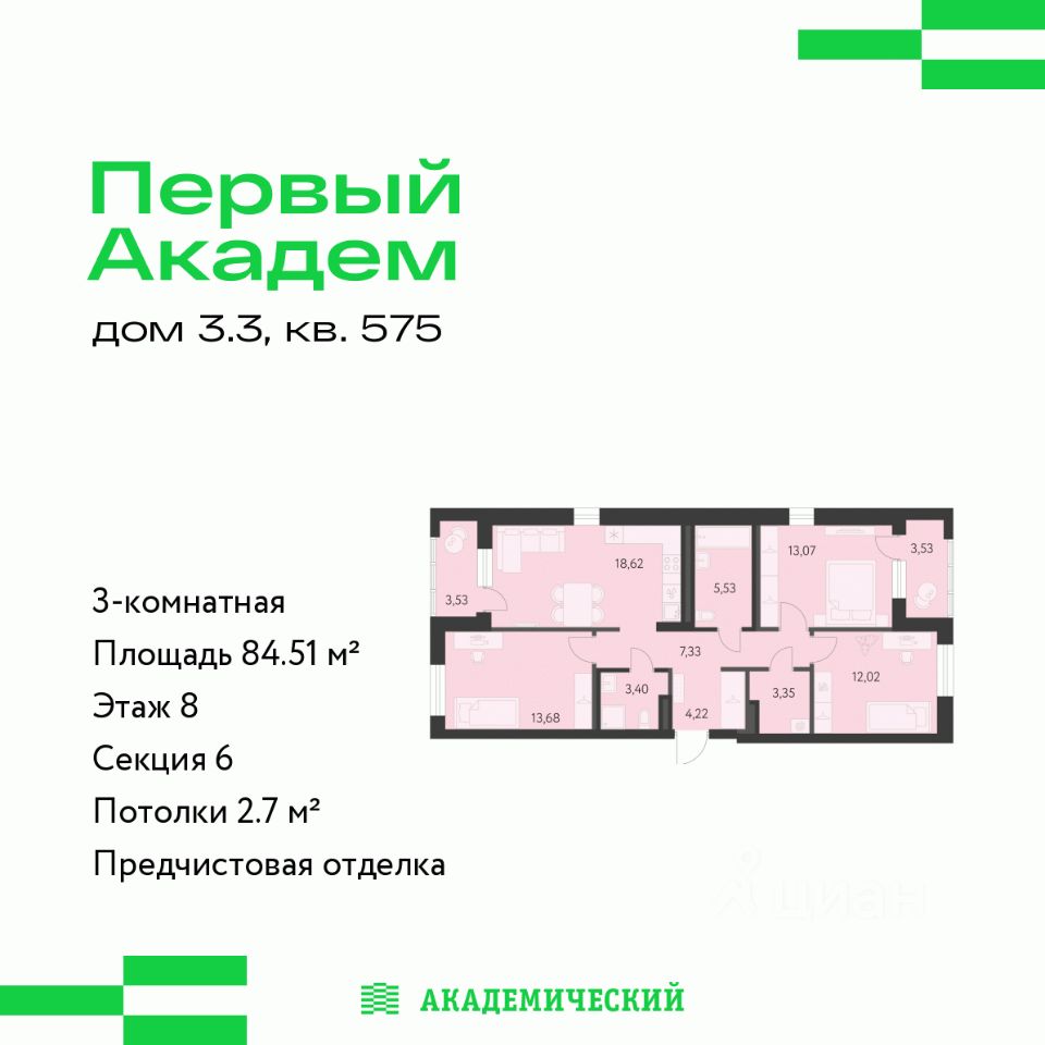 Продается 3-комнатная квартира площадью 84.51 кв.м. от девелопера ''Академический'' в жилом квартале ''Первый Академ''. Срок сдачи дома в 2028 году. Выгоды и скидка напрямую от застройщика.