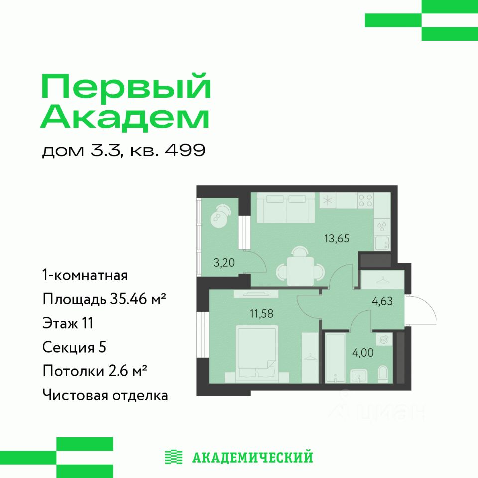 Продается 1-комнатная квартира площадью 35.46 кв.м. от девелопера ''Академический'' в жилом квартале ''Первый Академ''. Срок сдачи дома в 2028 году. Выгоды и скидка напрямую от застройщика.