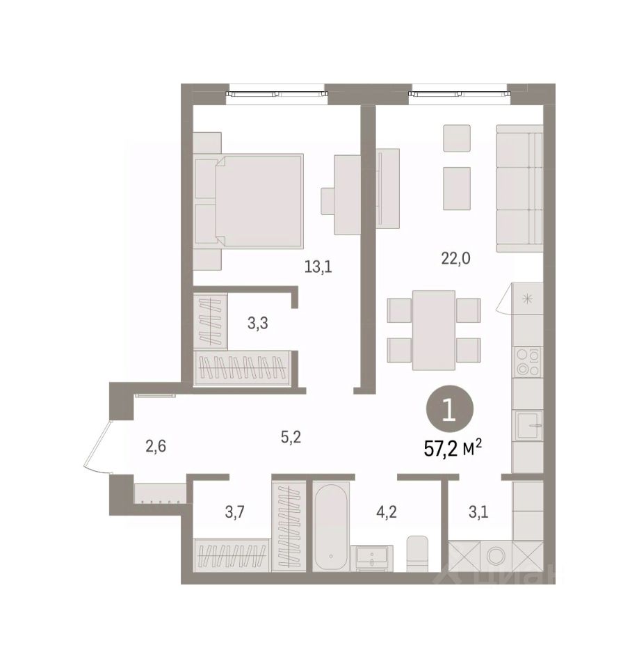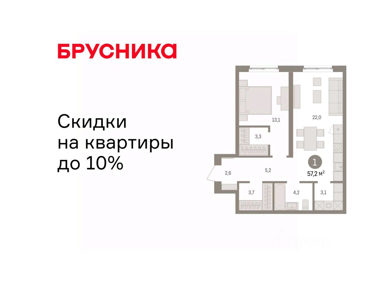 Квартира с кухней-гостиной и одной спальней в Южных кварталах. Особенности планировки: предчистовая отделка. квартиры в нашей базе: ЮКВ08-Ж1.5.9.