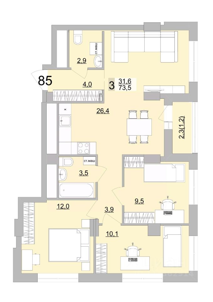 Общая площадь74,65 м2