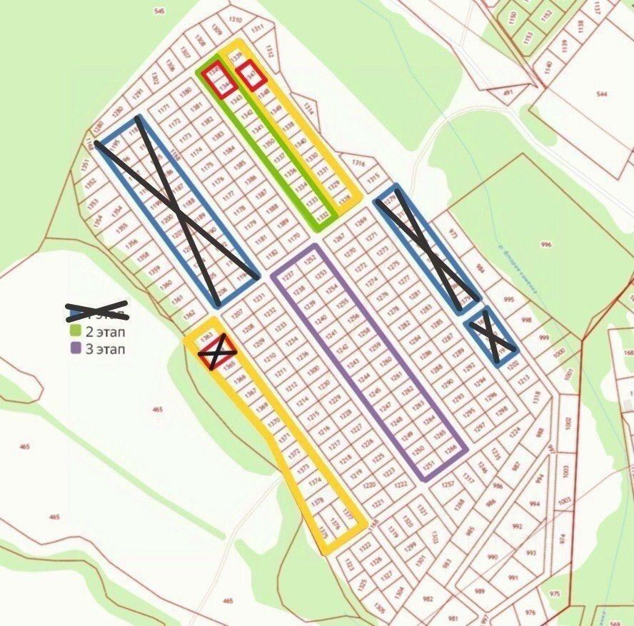 Участки, выделенные зеленым и фиолетовым: 47 000 р. За сотку. Выделенные желтым: 57 000 р. За сотку. Зачеркнутые проданы.