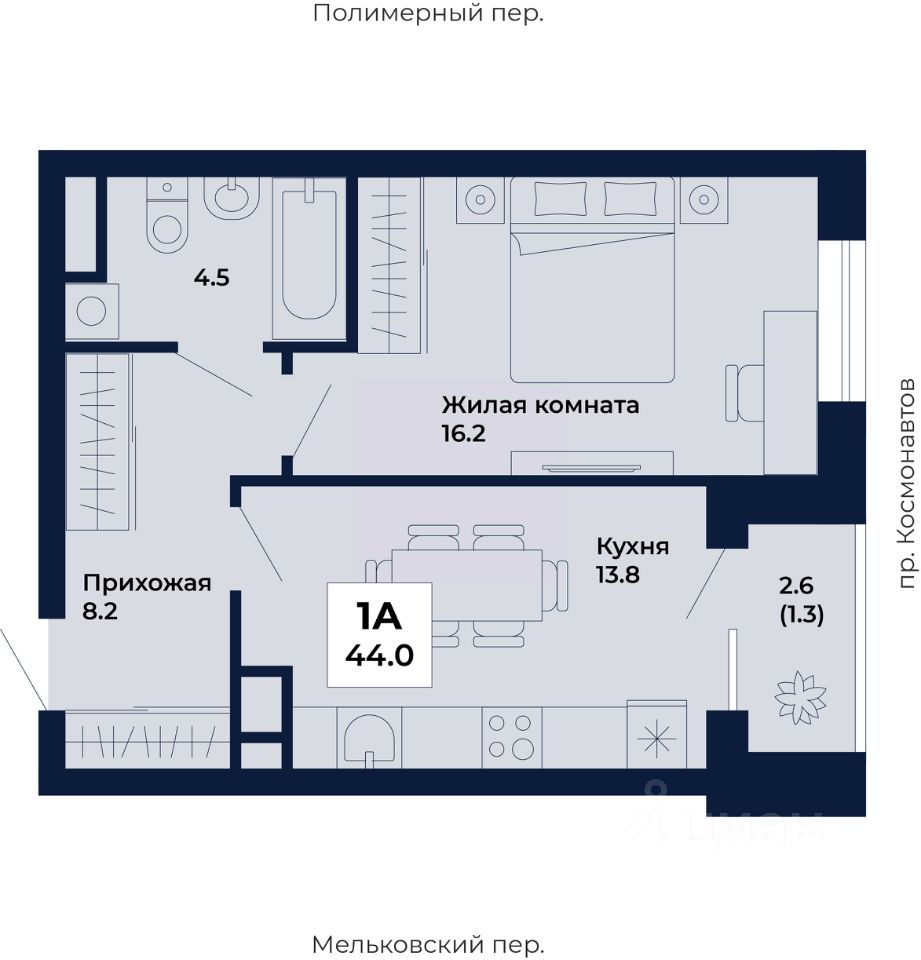 Продаётся 1-комнатная квартира в строящемся доме (Дом 8,9), срок сдачи: I-кв. 2029, общей площадью 44 кв.м., на 5 этаже. ЖК ''Космос'' - современный жилой квартал на проспекте Космонавтов 7, который строит ГК ''Ривьера Инвест Екатеринбург''. Жилой комплекс - это пять домов, благоустроенная территория комплекса и наземная парковка. Места общего пользования также выполнены в единой стилистике ''космической'' темы, используемой и в оформлении холлов, и дворов.