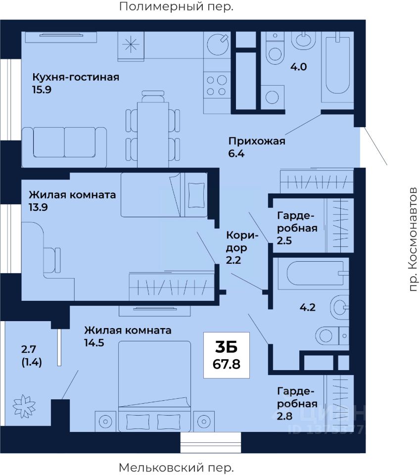 Продаётся 2-комнатная квартира в строящемся доме (Дом 8,9), срок сдачи: I-кв. 2029, общей площадью 67.8 кв.м., на 11 этаже. ЖК ''Космос'' - современный жилой квартал на проспекте Космонавтов 7, который строит ГК ''Ривьера Инвест Екатеринбург''. Жилой комплекс - это пять домов, благоустроенная территория комплекса и наземная парковка. Места общего пользования также выполнены в единой стилистике ''космической'' темы, используемой и в оформлении холлов, и дворов.