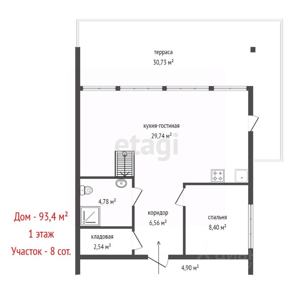 Большая кухня-гостиная с выходом на террасу. Просторная спальня. Плюс спальня-антресоль высотой 1,8 м и размерами 4 на 3,5 м. Есть небольшая кладовая.