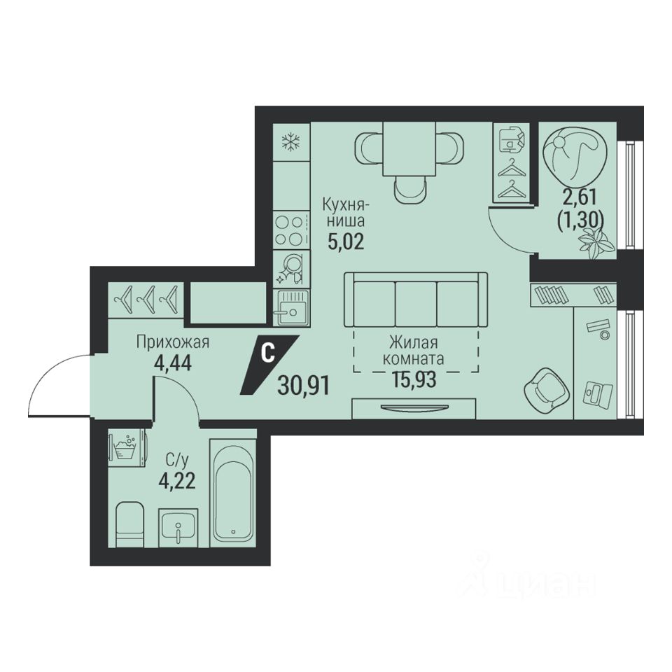 Общая площадь30,91 м2