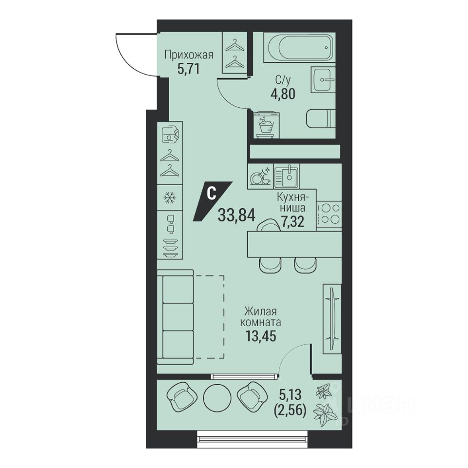 Общая площадь33,84 м2