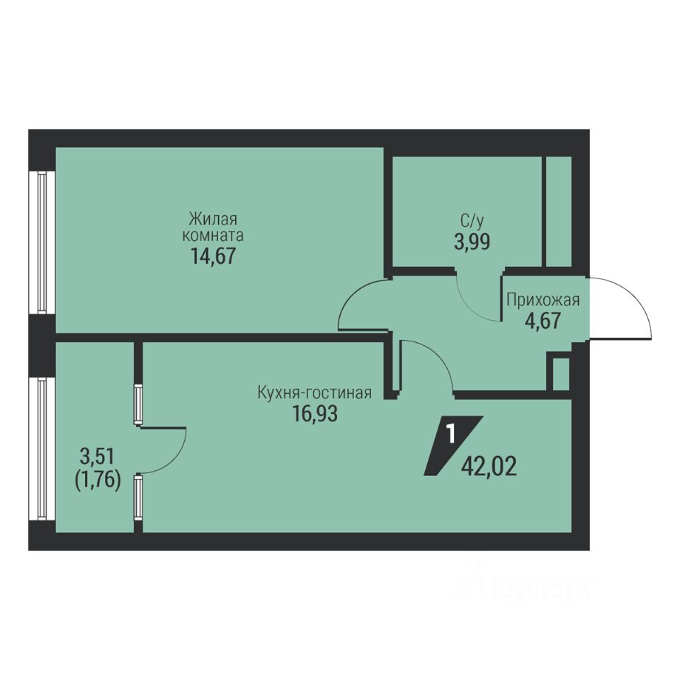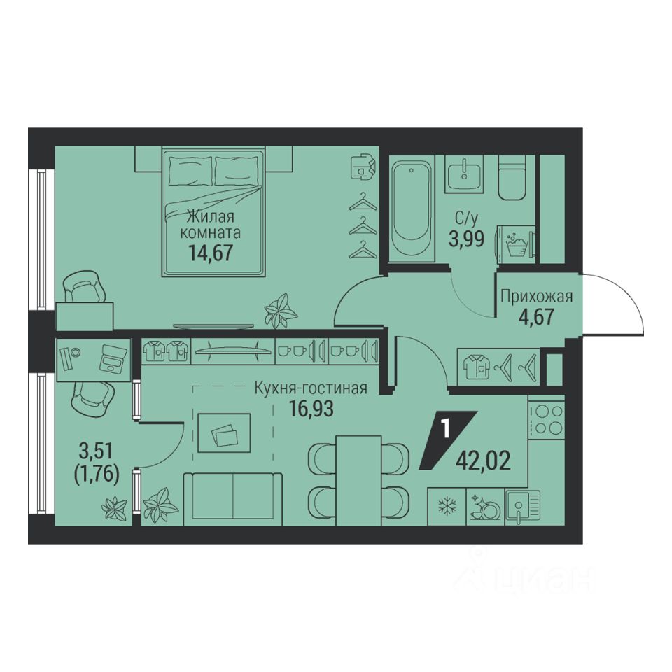 Общая площадь42,02 м2