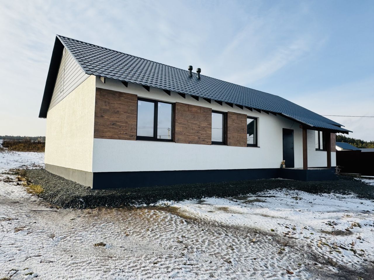 Дом 130 кв.м. плюс терраса. Планировка: - 3 жилые комнаты, одна из которых мастер-спальня, - просторная кухня-гостиная с панорамными окнами и с выходом на террасу, - санузел, - бойлерная, - коридор с прихожей.