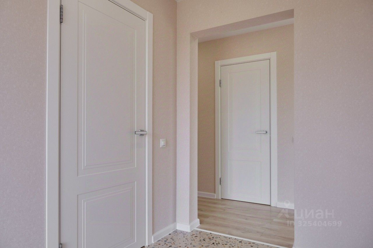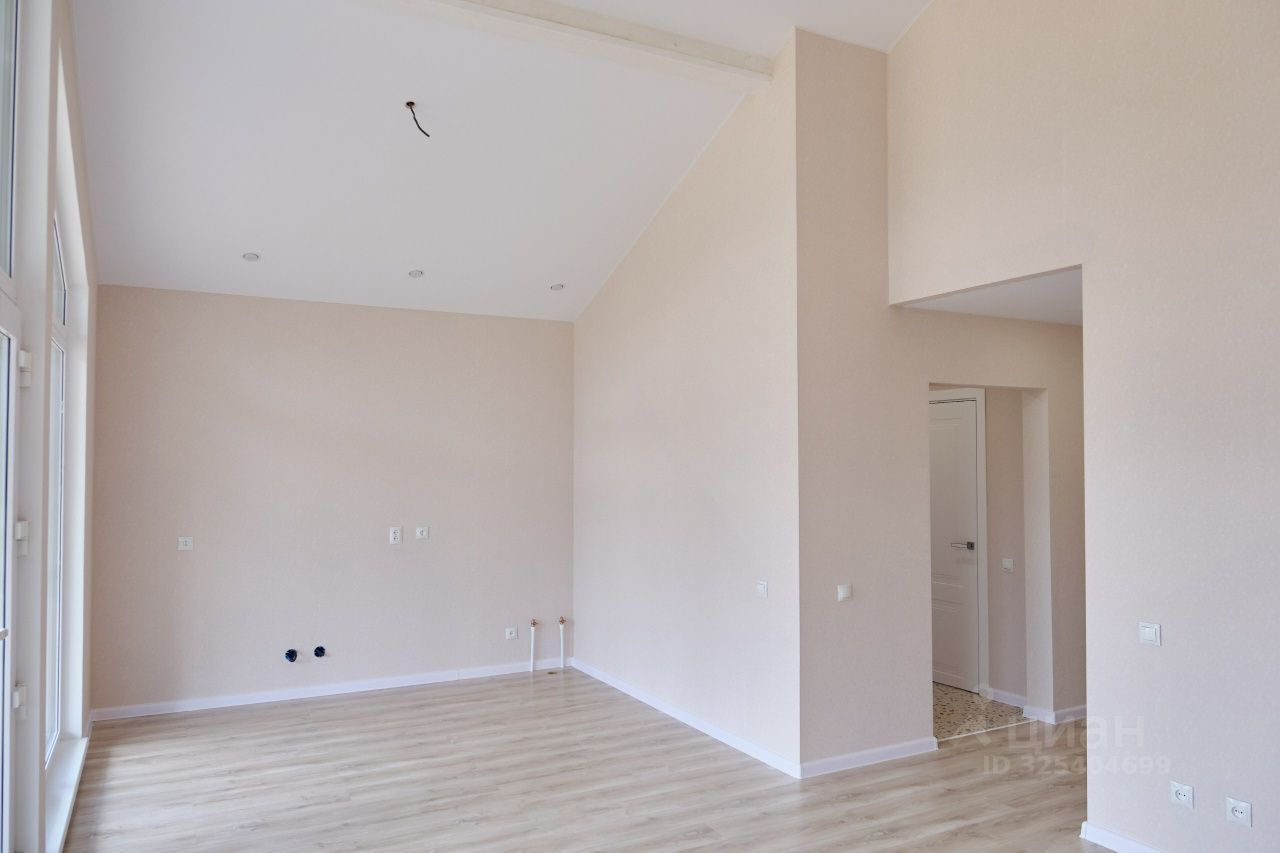 Планировка включает просторную кухню-гостиную с высокими потолками, две изолированные спальни, гардеробную комнату, санузел.