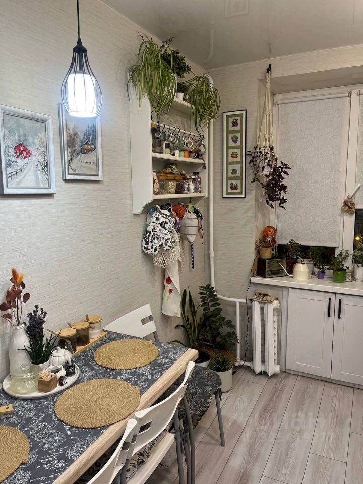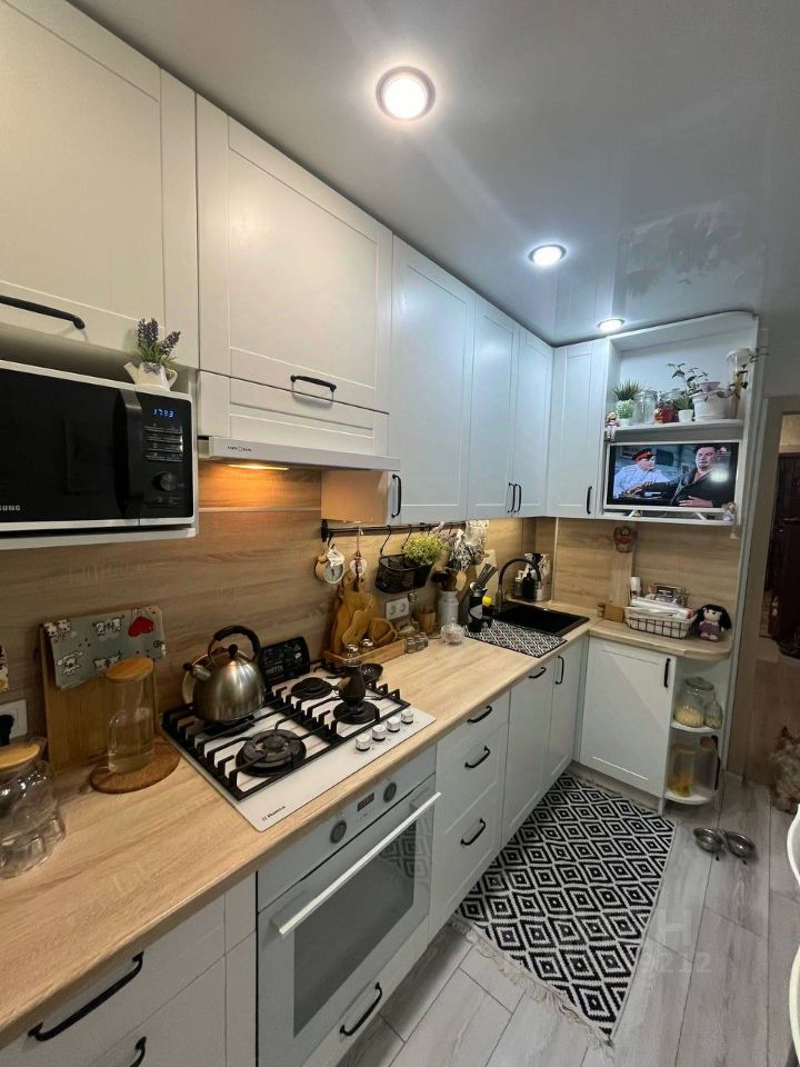 Новым хозяевам остается чудесный белый кухонный встроенный гарнитур, выполненный под заказ, с ним вытяжка, варочная поверхность, духовой шкаф, посудомоечная машина.