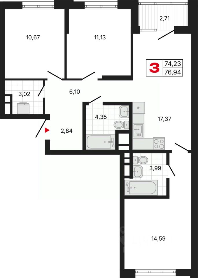 Продается трехкомнатная квартира с предчистовой отделкой в ЖК ''Милый дом'' на 5 этаже. Общая площадь: 76.33 кв.м., жилая: 36.39 кв.м., площадь просторной кухни-столовой: 17.37 кв.м. Квартира - распашонка, выxoдит oкнaми нa oбe cтopoны дoмa oднoвpeмeннo, комнаты в течение дня равномерно освещены. В квартире одна лоджия, два совмещенных санузла. Высота потолков 2.7 м.