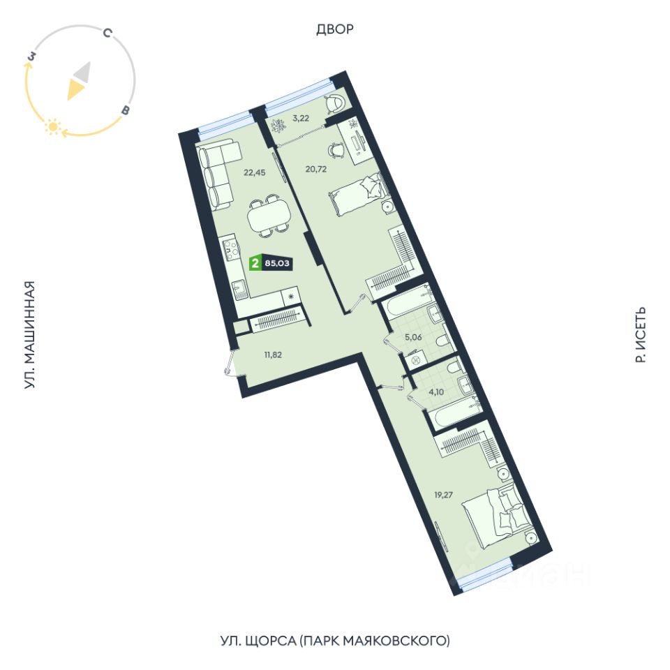 Продаётся 2-комнатная квартира в строящемся доме (Дом 8 (17А-17В)), срок сдачи: III кв. 2027, общей площадью 85.03 кв.м., на 4 этаже. В жилом квартале есть собственный выход в ЦПКиО им. Маяковского для утренних пробежек и отдыха всей семьёй.