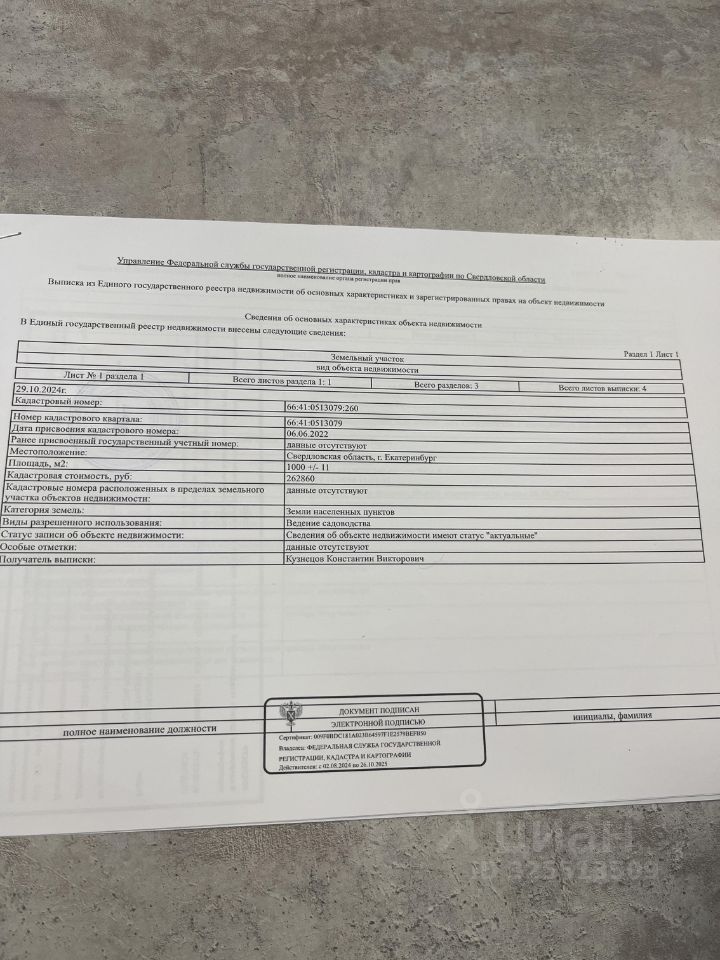 В продаже Земельный участок Кад. номер: 66:41:0513079:260 Статус: Учтенный. Адрес: Свердловская область, г. Екатеринбург. Категория земель: Земли населенных пунктов. Форма собственности: Частная. Уточненная площадь:1000 кв.м. Разрешенное использование: Ведение садоводства. Электричество к посёлку подведено. Дороги отсыпаны до участка. На машине 5 минут от Горного щита. До горного щита стабильно ходит транспорт, есть школа, детский сад , магазины и строительный рынок. Участок на возвышенности в живописном месте. Не подтопляемый, грунтовые воды низко, грунт стабильный. Поселок множится в нём ведется повсеместное строительство. Один взрослый собственник, документы к продаже готовы, причина продажи-переезд в другой город.