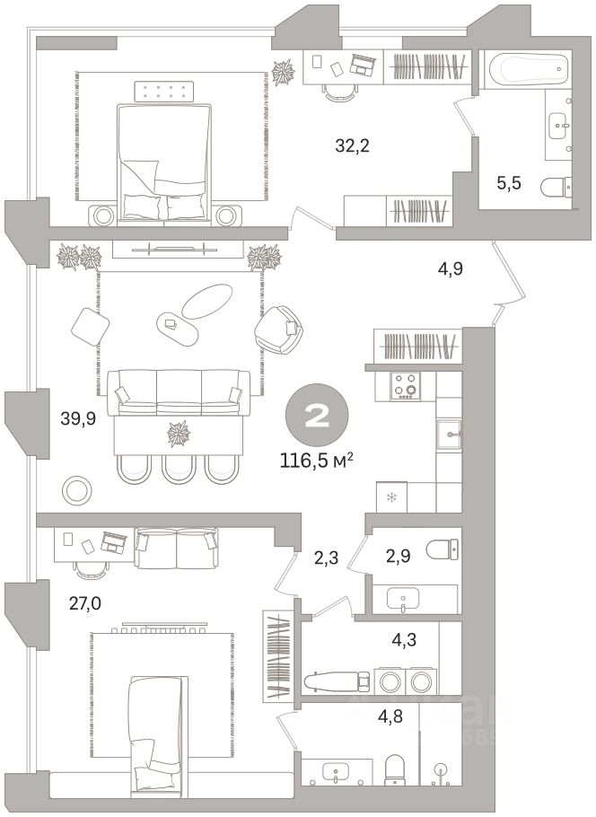Продается двухкомнатная квартира от застройщика с предчистовой отделкой в ЖК ''Гоголя 21'' на 6 этаже. Общая площадь: 116.45 кв.м., жилая: 59.2 кв.м., площадь просторной кухни-столовой: 39.9 кв.м. Угловая квартира, очень светлая, естественная вентиляция при открытии окон. В квартире два совмещенных и один раздельный санузел. Высота потолков 2.98 м.