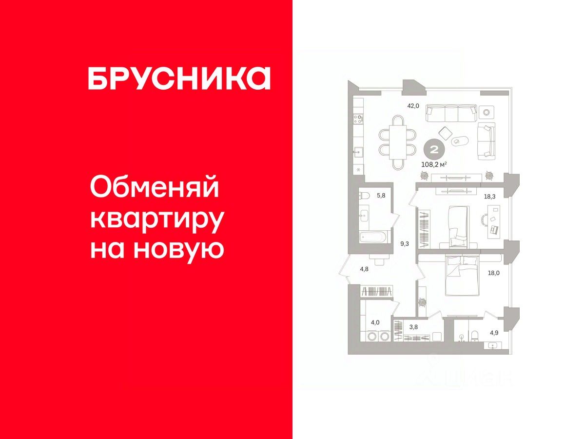 2-комн. квартира с предчистовой отделкой в ЖК ''Гоголя 21'' на 12 этаже. Общая площадь: 108.18 кв.м., жилая: 36.3 кв.м., площадь просторной кухни-столовой: 42 кв.м. Угловая квартира, окна oбecпeчивaют paвнoмepнoe ocвeщeниe в тeчeниe дня. В квартире два совмещенных санузла. Высота потолков 2.98 м.