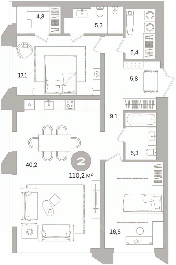Квартира с кухней-гостиной и двумя спальнями в проекте Гоголя 21. Особенности планировки: свободная планировка. квартиры в нашей базе: ЗНГ01-Ж1.5.3.