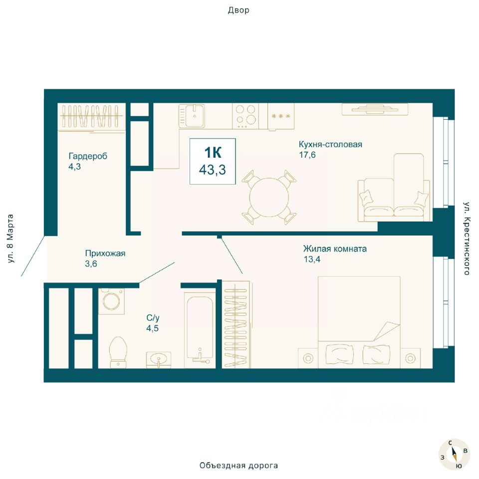Общая площадь43,3 м2