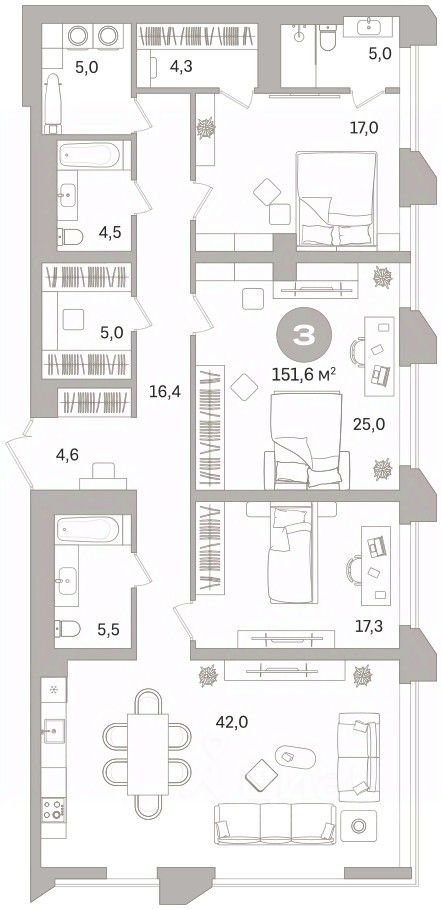 3-комн. квартира с предчистовой отделкой в ЖК ''Гоголя 21'' на 4 этаже. Общая площадь: 151.59 кв.м., жилая: 59.3 кв.м., площадь просторной кухни-столовой: 42 кв.м. Угловая квартира, очень светлая, естественная вентиляция при открытии окон. В квартире три совмещенных санузла. Высота потолков 2.98 м.