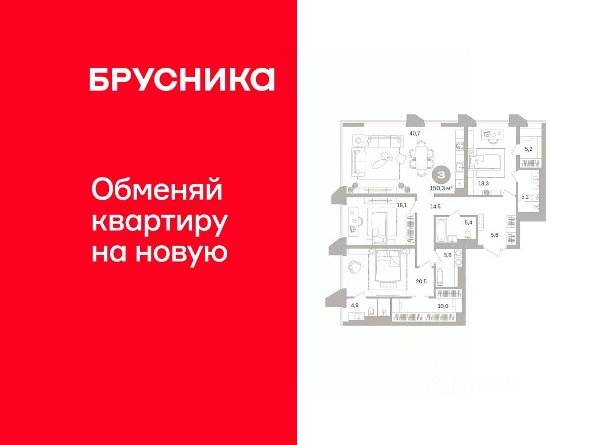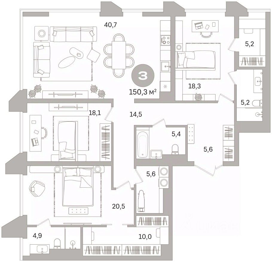 Квартира с кухней-гостиной и тремя спальнями в проекте Гоголя 21. Особенности планировки: свободная планировка. квартиры в нашей базе: ЗНГ01-Ж1.15.4.
