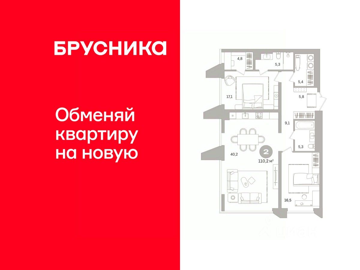 Квартира с кухней-гостиной и двумя спальнями в проекте Гоголя 21.