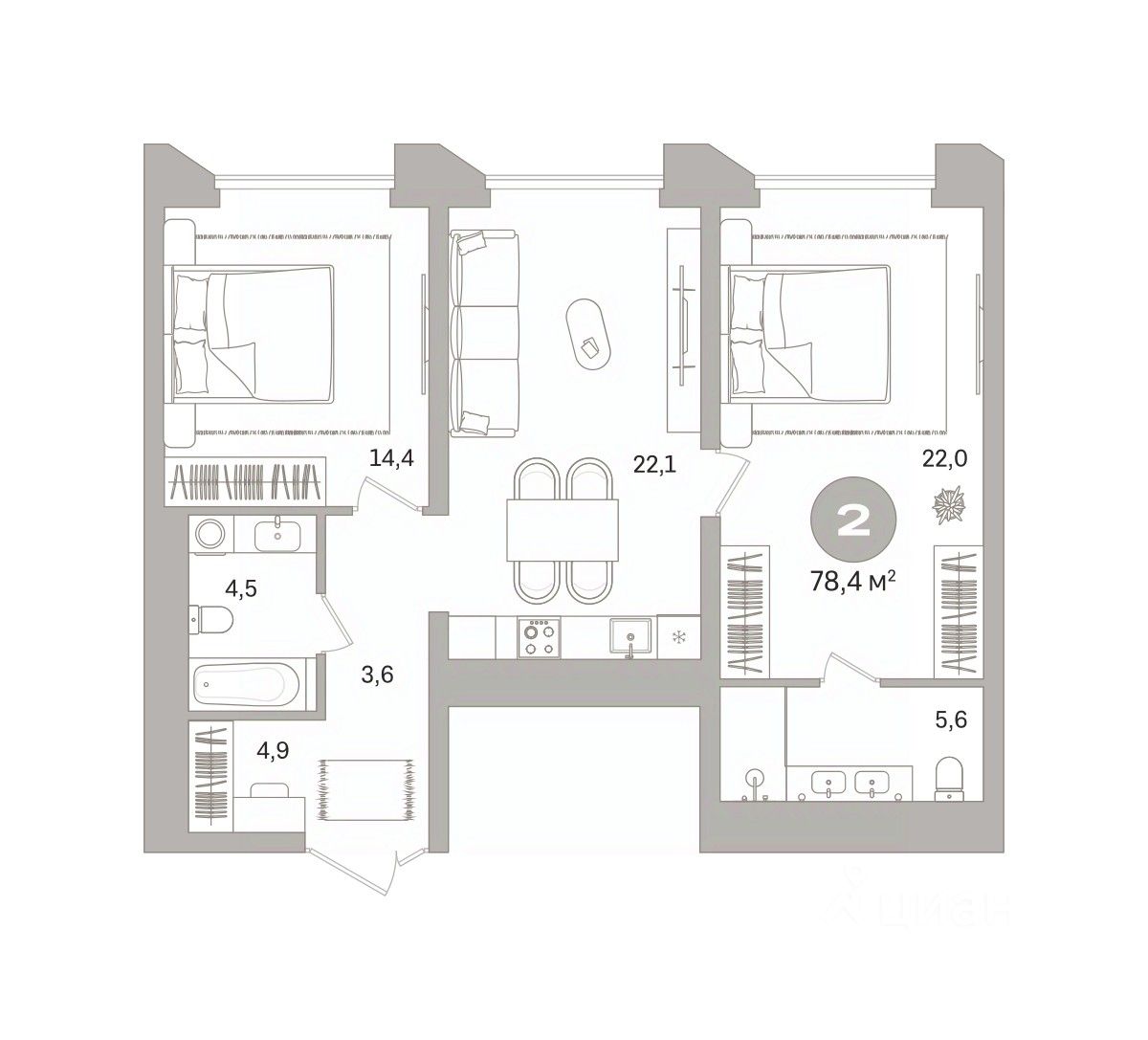 Двухкомнатная квартира от застройщика с предчистовой отделкой в ЖК ''Гоголя 21'' на 4 этаже. Общая площадь: 78.39 кв.м., жилая: 36.4 кв.м., площадь просторной кухни-столовой: 22.1 кв.м. Комнаты изолированные, все окна выходят на одну сторону. В квартире два совмещенных санузла. Высота потолков 2.98 м.