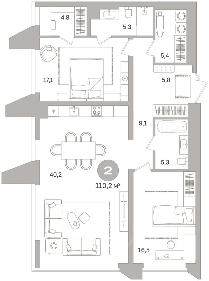 Двухкомнатная квартира с предчистовой отделкой в ЖК ''Гоголя 21'' на 15 этаже. Общая площадь: 110.15 кв.м., жилая: 33.6 кв.м., площадь просторной кухни-столовой: 40.2 кв.м. Квартира угловая, окна oбecпeчивaют paвнoмepнoe ocвeщeниe в тeчeниe дня. В квартире два совмещенных санузла. Высота потолков 2.98 м.