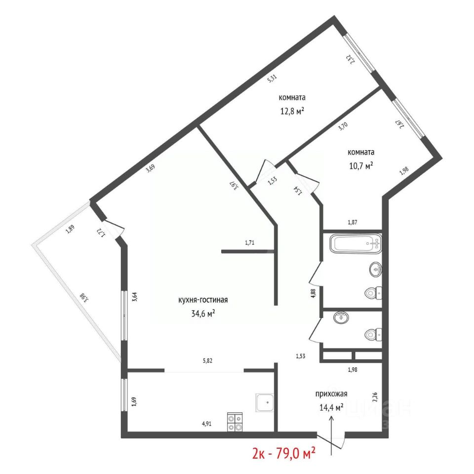 В продаже просторная квартира формата - Евро-3. Объект состоит из большой кухни-гостиной 34,6м2 и двух изолированных комнат, соединенных просторным коридором с двумя раздельными санузлами.