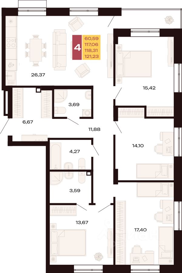 Продается Многокомнатная квартира площадью 121.23 кв.м. на 2 этаже. Квартира в ЖК ''Первый Южный'' располагается в центральной части перспективного микрорайона, в границах улиц Шаумяна, Амундсена, Волгоградской и Советских Женщин с отличной транспортной доступностью, близостью к центру и развитой социальной инфраструктурой.