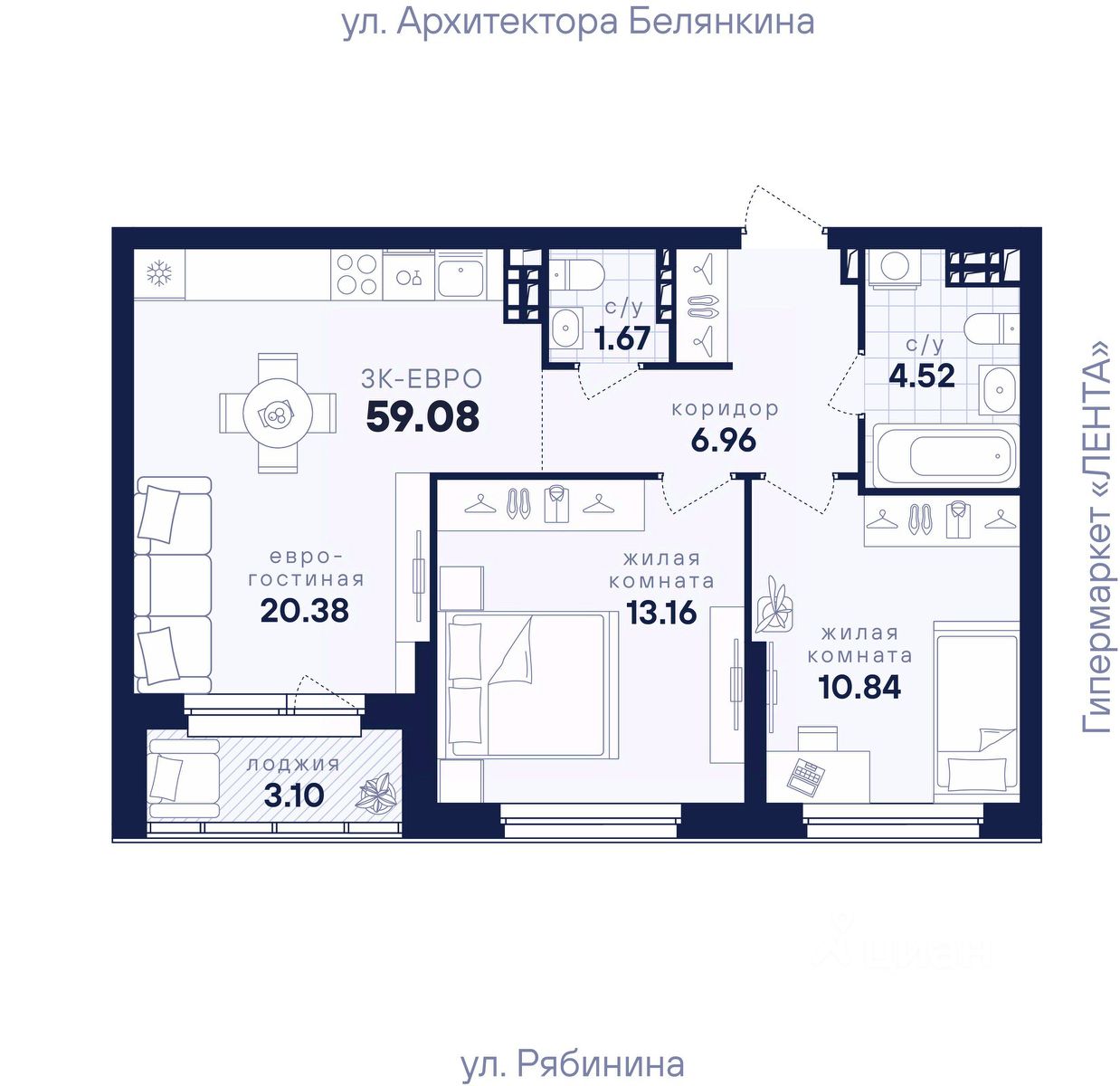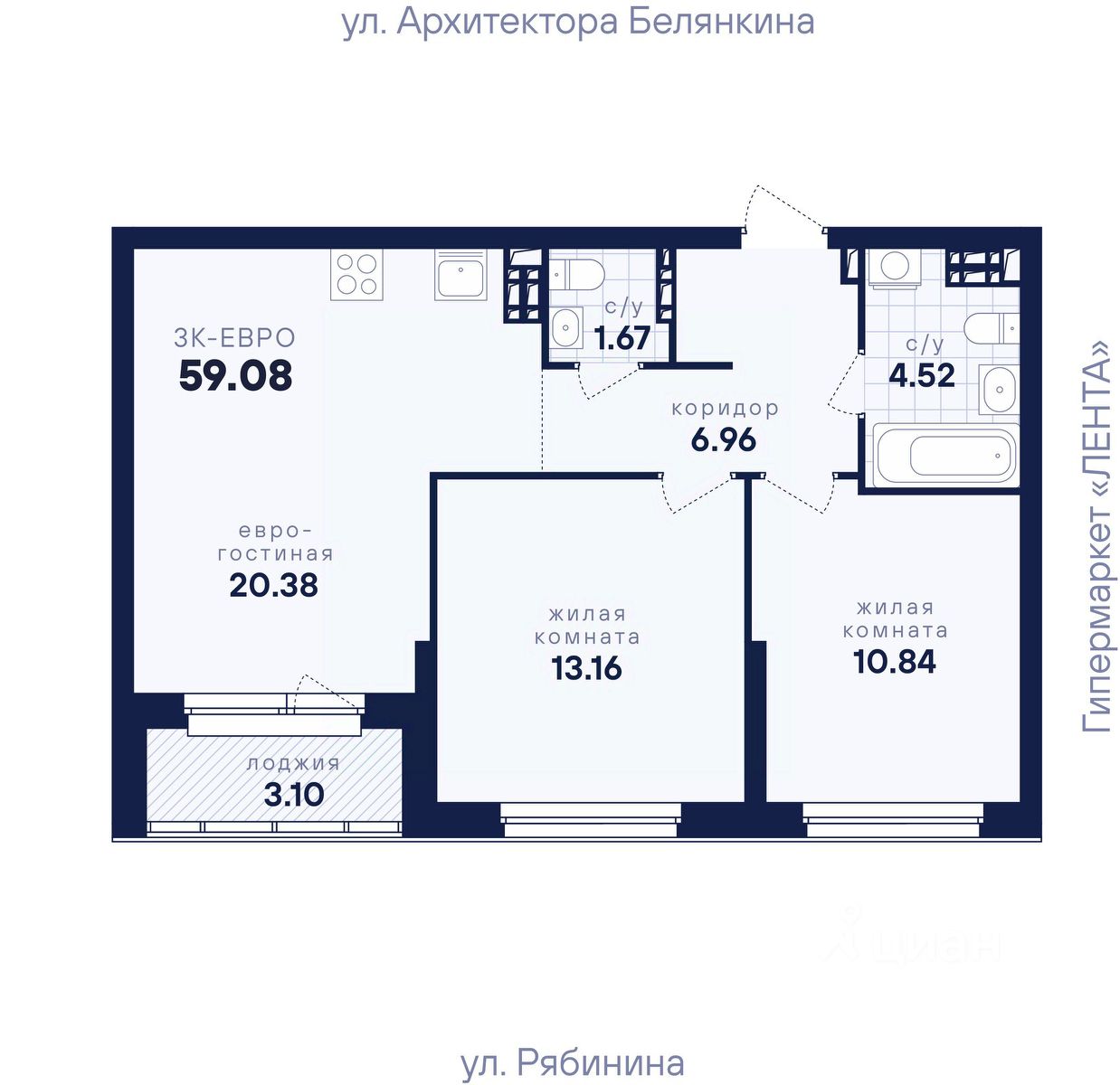 Общая площадь59,08 м2