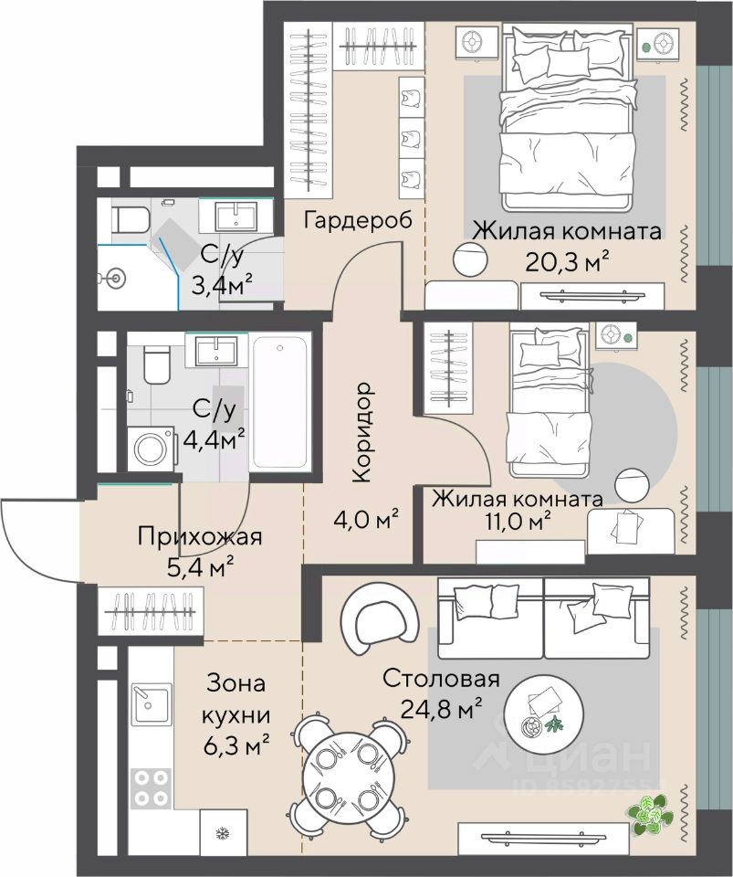 Продаётся 2-комнатная квартира в строящемся доме (Секции 2.3-2.4), срок сдачи: I-кв. 2032, общей площадью 73.3 кв.м., на 11 этаже.