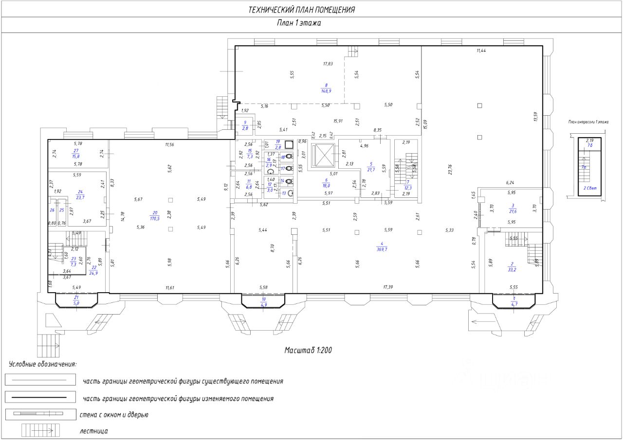 Площадь первого этажа 836,5 кв.м. Площадь цокольного этажа 791,2 кв.м. 1/3 земельного участка общей площадью 5310 кв.м. в собственности.