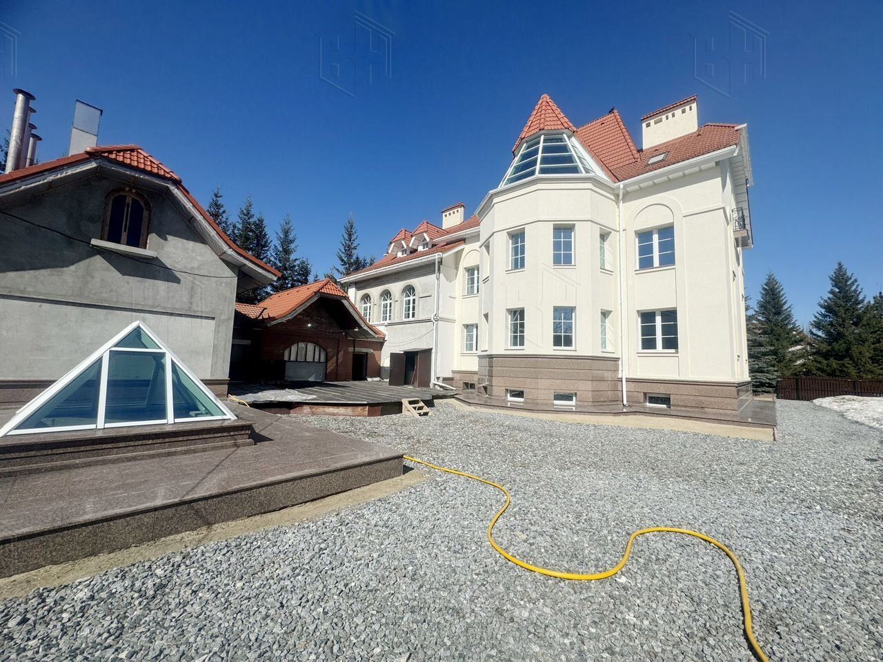 Многоскатная крыша подчеркивает уникальный стиль здания и придает ему презентабельный характер. В конструкции крыши используется металлическая стропильная система, клееный брус, идеально правильно выполнены: обрешетка, утепление, гидроизоляция, пароизоляция, вентиляция получив эффект термоса. Кровельное покрытие: минеральная (цементно-песчаная) черепица Вrааs - лучший выбор для вашей крыши. Произведены работы чердачных помещений: уложен керамогранит, проведено освещение.