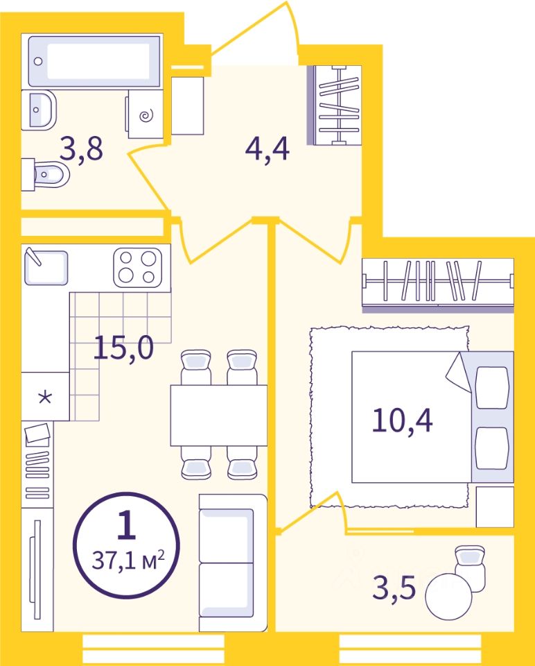 1-комн. квартира от застройщика с предчистовой отделкой в ЖК ''Астон.Движение'' на 6 этаже. Общая площадь: 35.38 кв.м., жилая: 10.4 кв.м., площадь просторной кухни-столовой: 15 кв.м. Все окна выходят на одну сторону. В квартире одна лоджия, один совмещенный санузел. Высота потолков 2.7 м.